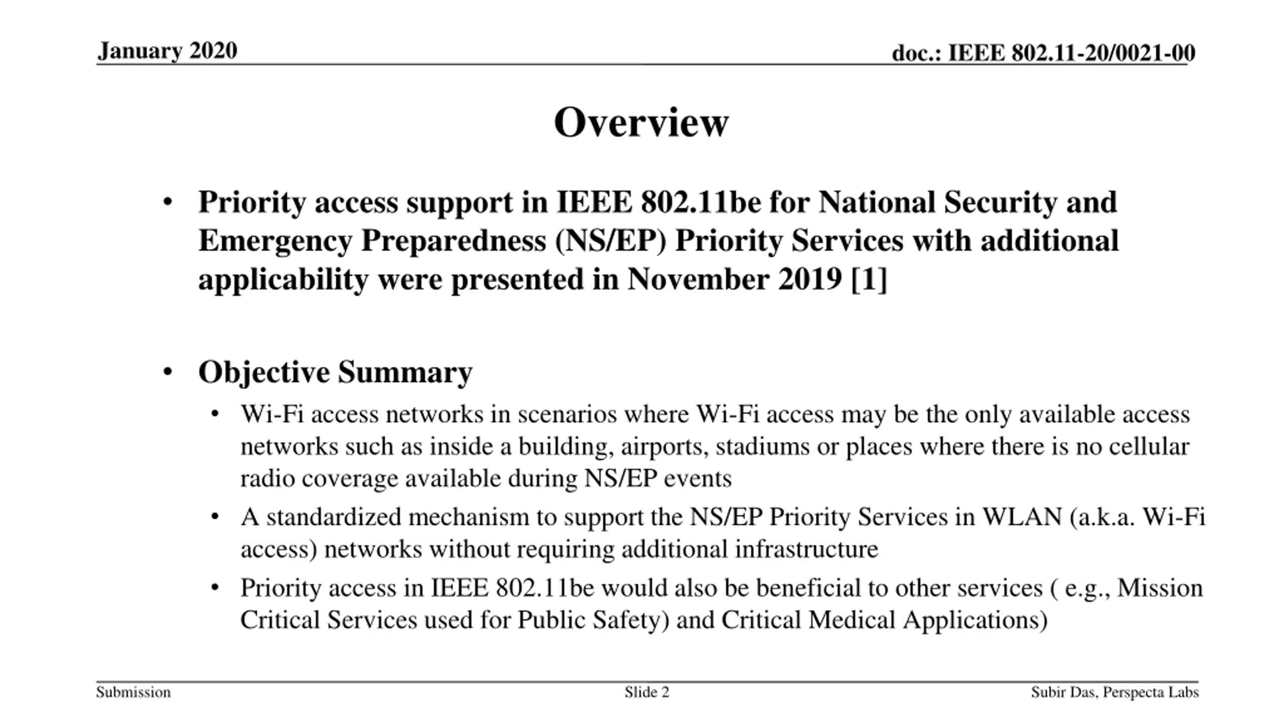 January 2020 doc.: IEEE 802.11-20/0021-00 Overview Priority access support in IEEE 802.11be for National Security and Emergency Preparedness (NS/EP) Priority Services with additional applicability were presented in November 2019 [1] Objective Summary Wi-Fi access networks in scenarios where Wi-Fi access may be the only available access networks such as inside a building, airports, stadiums or places where there is no cellular radio coverage available during NS/EP events A standardized mechanism to support the NS/EP Priority Services in WLAN (a.k.a. Wi-Fi access) networks without requiring additional infrastructure Priority access in IEEE 802.11be would also be beneficial to other services ( e.g., Mission Critical Services used for Public Safety) and Critical Medical Applications) Submission Slide 2 Subir Das, Perspecta Labs