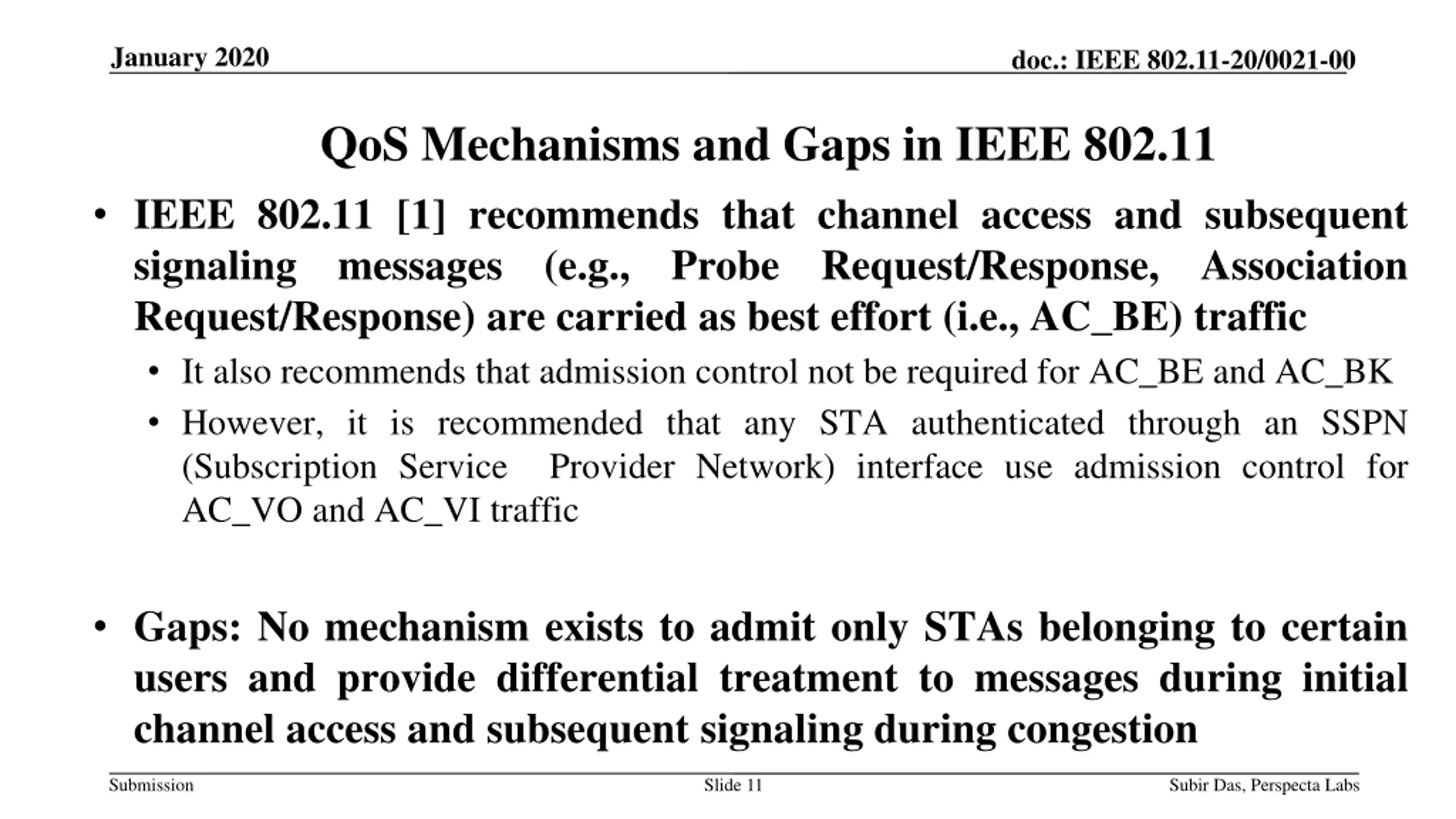 January 2020 doc.: IEEE 802.11-20/0021-00 QoS Mechanisms and Gaps in IEEE 802.11 IEEE 802.11 [1] defines Intra-access category prioritization for stream classification in a non-AP STA or in an AP STA A non-AP STA may send Intra-AC Priority element to indicate the relative priorities of streams within an AC This element is optionally present in ADDTS Request, QoS Map or SCS Request frames User Priority(UP) subfield allows one to indicate the stream priority Gaps: No mechanism is available for prioritization between traffic streams belonging to the same Access Category that originate from different STAs (e.g., No means to differentiate NS/EP Priority Service traffic from other traffic in the same class) Submission Slide 10 Subir Das, Perspecta Labs