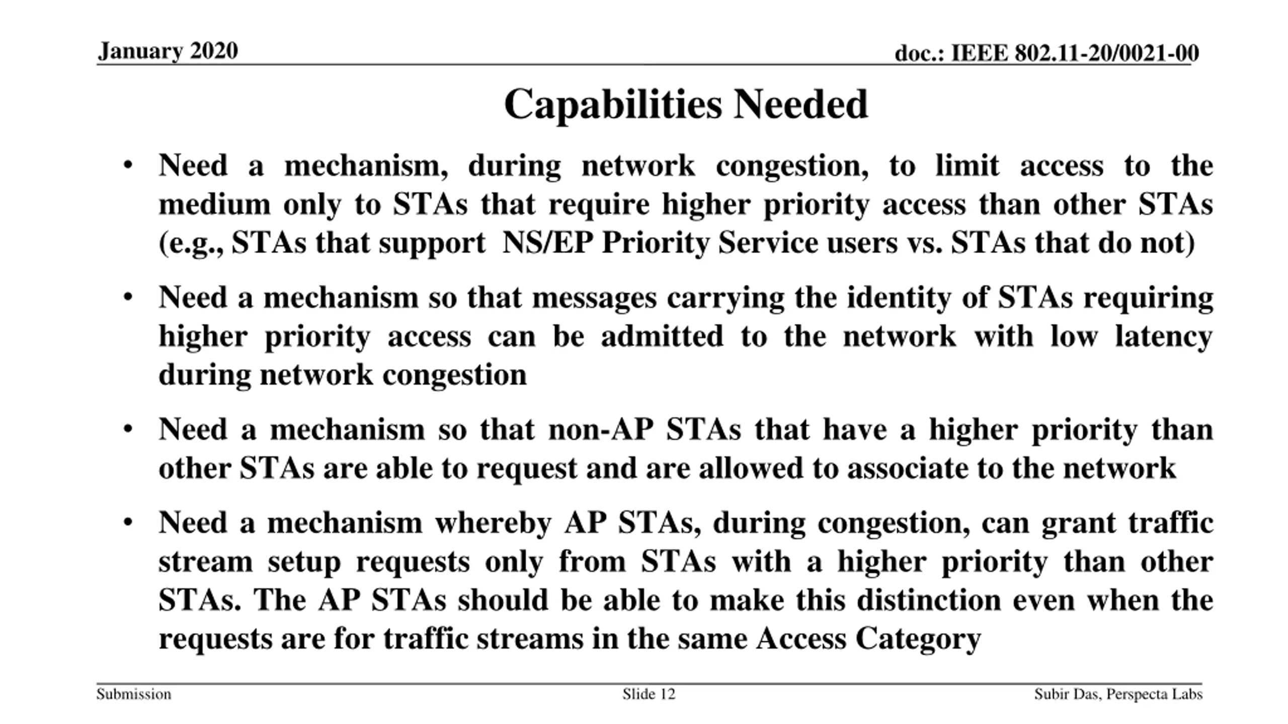 January 2020 doc.: IEEE 802.11-20/0021-00 QoS Mechanisms and Gaps in IEEE 802.11 IEEE 802.11 [1] recommends that channel access and subsequent signaling messages (e.g., Probe Request/Response, Association Request/Response) are carried as best effort (i.e., AC_BE) traffic It also recommends that admission control not be required for AC_BE and AC_BK However, it is recommended that any STA authenticated through an SSPN (Subscription Service Provider Network) interface use admission control for AC_VO and AC_VI traffic Gaps: No mechanism exists to admit only STAs belonging to certain users and provide differential treatment to messages during initial channel access and subsequent signaling during congestion Submission Slide 11 Subir Das, Perspecta Labs