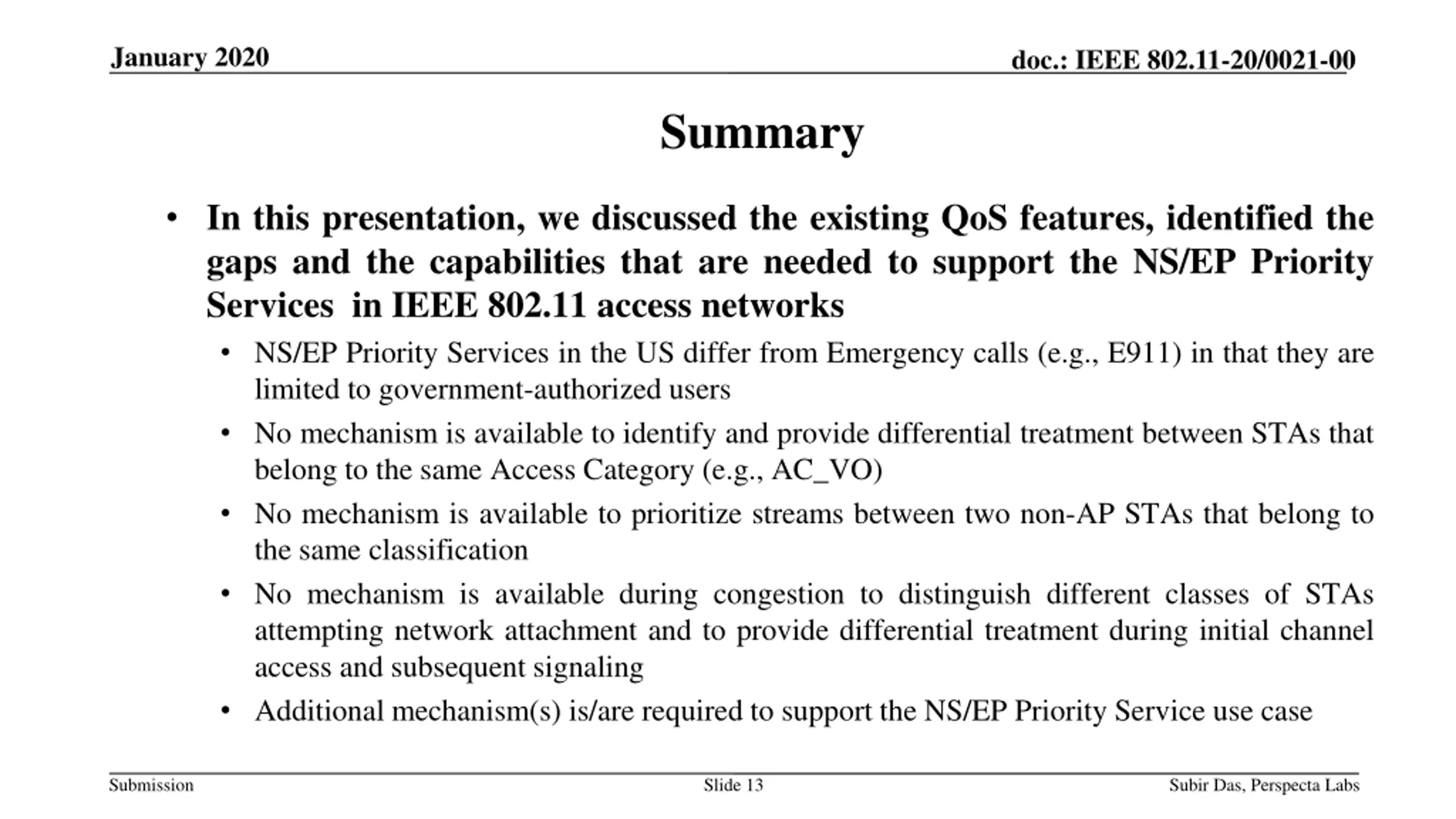 January 2020 doc.: IEEE 802.11-20/0021-00 Summary In this presentation, we discussed the existing QoS features, identified the gaps and the capabilities that are needed to support the NS/EP Priority Services in IEEE 802.11 access networks NS/EP Priority Services in the US differ from Emergency calls (e.g., E911) in that they are limited to government-authorized users No mechanism is available to identify and provide differential treatment between STAs that belong to the same Access Category (e.g., AC_VO) No mechanism is available to prioritize streams between two non-AP STAs that belong to the same classification No mechanism is available during congestion to distinguish different classes of STAs attempting network attachment and to provide differential treatment during initial channel access and subsequent signaling Additional mechanism(s) is/are required to support the NS/EP Priority Service use case Submission Slide 13 Subir Das, Perspecta Labs