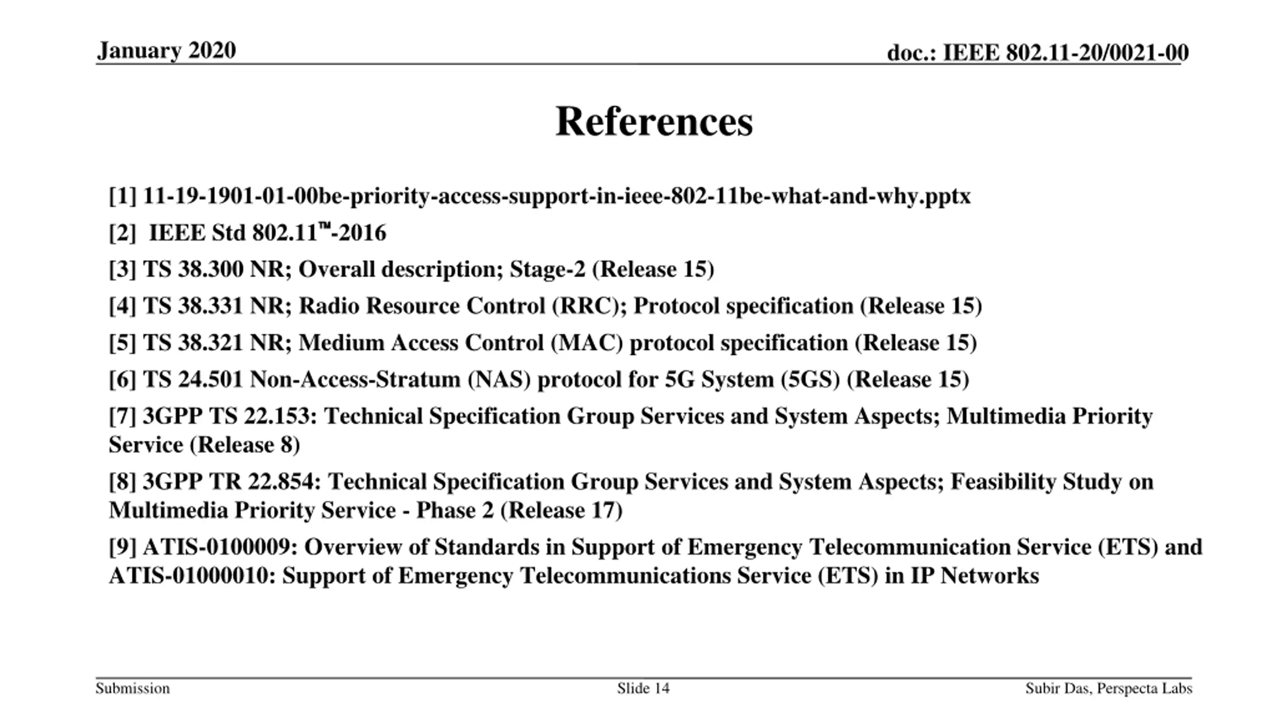 January 2020 doc.: IEEE 802.11-20/0021-00 References [1] 11-19-1901-01-00be-priority-access-support-in-ieee-802-11be-what-and-why.pptx [2] IEEE Std 802.11 -2016 [3] TS 38.300 NR; Overall description; Stage-2 (Release 15) [4] TS 38.331 NR; Radio Resource Control (RRC); Protocol specification (Release 15) [5] TS 38.321 NR; Medium Access Control (MAC) protocol specification (Release 15) [6] TS 24.501 Non-Access-Stratum (NAS) protocol for 5G System (5GS) (Release 15) [7] 3GPP TS 22.153: Technical Specification Group Services and System Aspects; Multimedia Priority Service (Release 8) [8] 3GPP TR 22.854: Technical Specification Group Services and System Aspects; Feasibility Study on Multimedia Priority Service - Phase 2 (Release 17) [9] ATIS-0100009: Overview of Standards in Support of Emergency Telecommunication Service (ETS) and ATIS-01000010: Support of Emergency Telecommunications Service (ETS) in IP Networks Submission Slide 14 Subir Das, Perspecta Labs