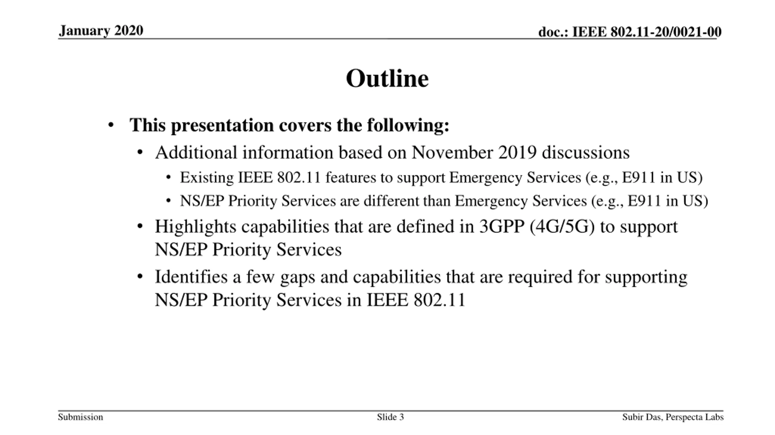 January 2020 doc.: IEEE 802.11-20/0021-00 Outline This presentation covers the following: Additional information based on November 2019 discussions Existing IEEE 802.11 features to support Emergency Services (e.g., E911 in US) NS/EP Priority Services are different than Emergency Services (e.g., E911 in US) Highlights capabilities that are defined in 3GPP (4G/5G) to support NS/EP Priority Services Identifies a few gaps and capabilities that are required for supporting NS/EP Priority Services in IEEE 802.11 Submission Slide 3 Subir Das, Perspecta Labs