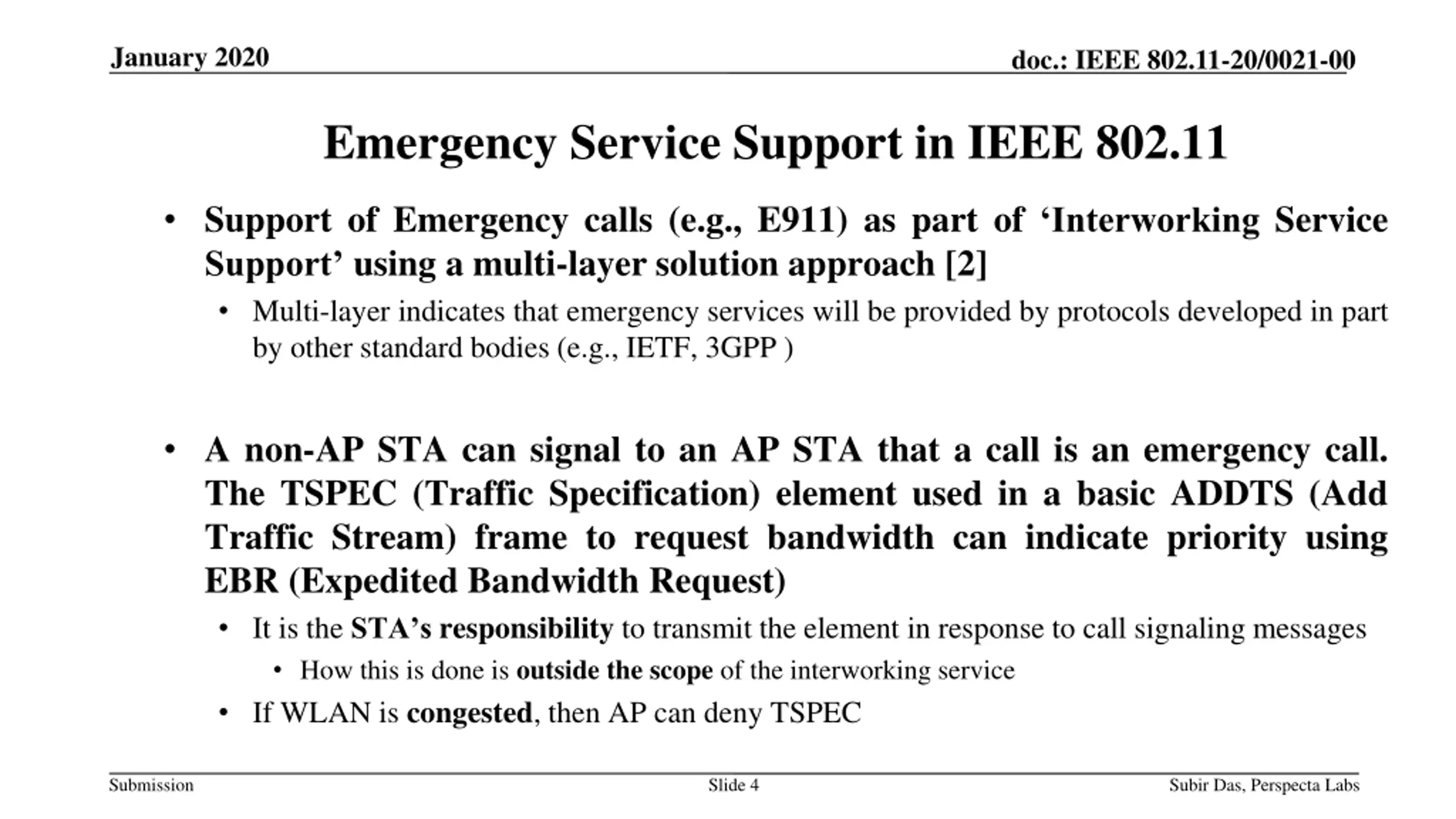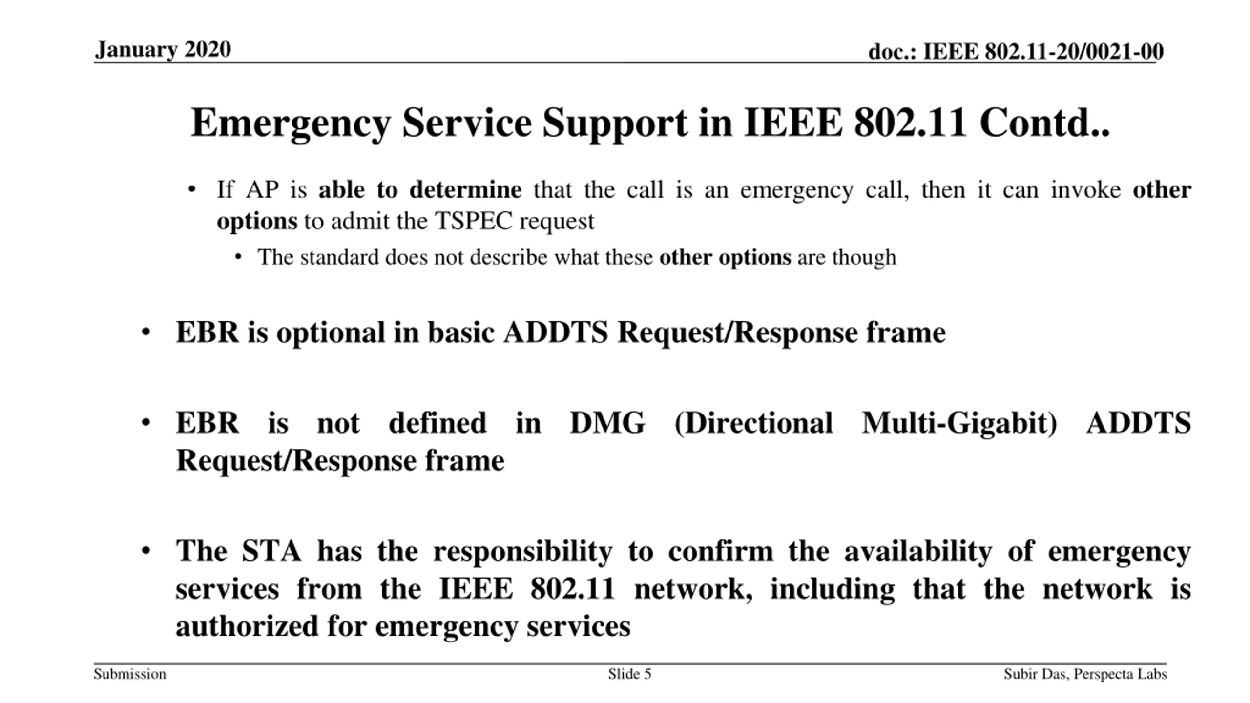 January 2020 doc.: IEEE 802.11-20/0021-00 Emergency Service Support in IEEE 802.11 Support of Emergency calls (e.g., E911) as part of Interworking Service Support using a multi-layer solution approach [2] Multi-layer indicates that emergency services will be provided by protocols developed in part by other standard bodies (e.g., IETF, 3GPP ) A non-AP STA can signal to an AP STA that a call is an emergency call. The TSPEC (Traffic Specification) element used in a basic ADDTS (Add Traffic Stream) frame to request bandwidth can indicate priority using EBR (Expedited Bandwidth Request) It is the STA s responsibility to transmit the element in response to call signaling messages How this is done is outside the scope of the interworking service If WLAN is congested, then AP can deny TSPEC Submission Slide 4 Subir Das, Perspecta Labs