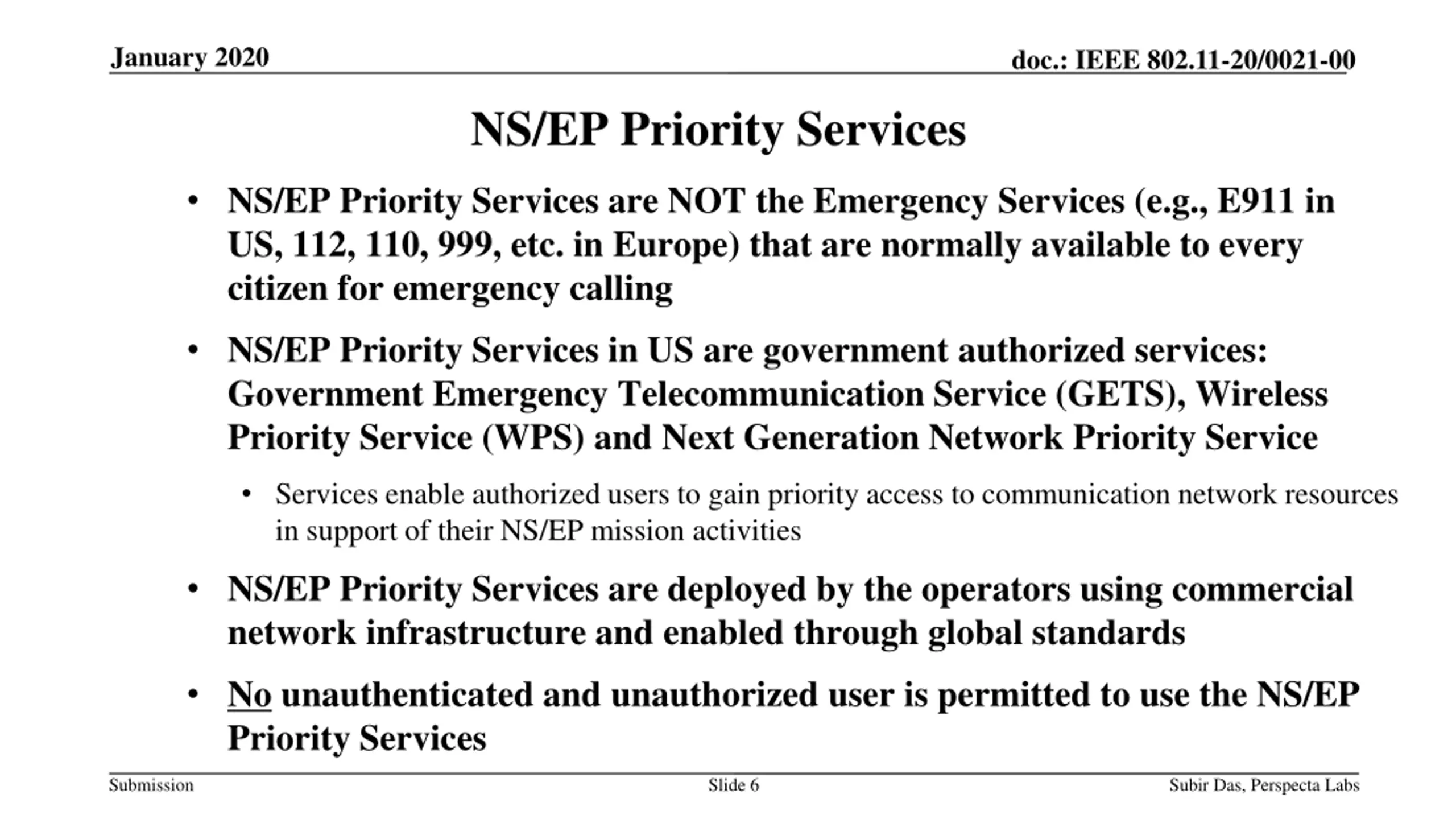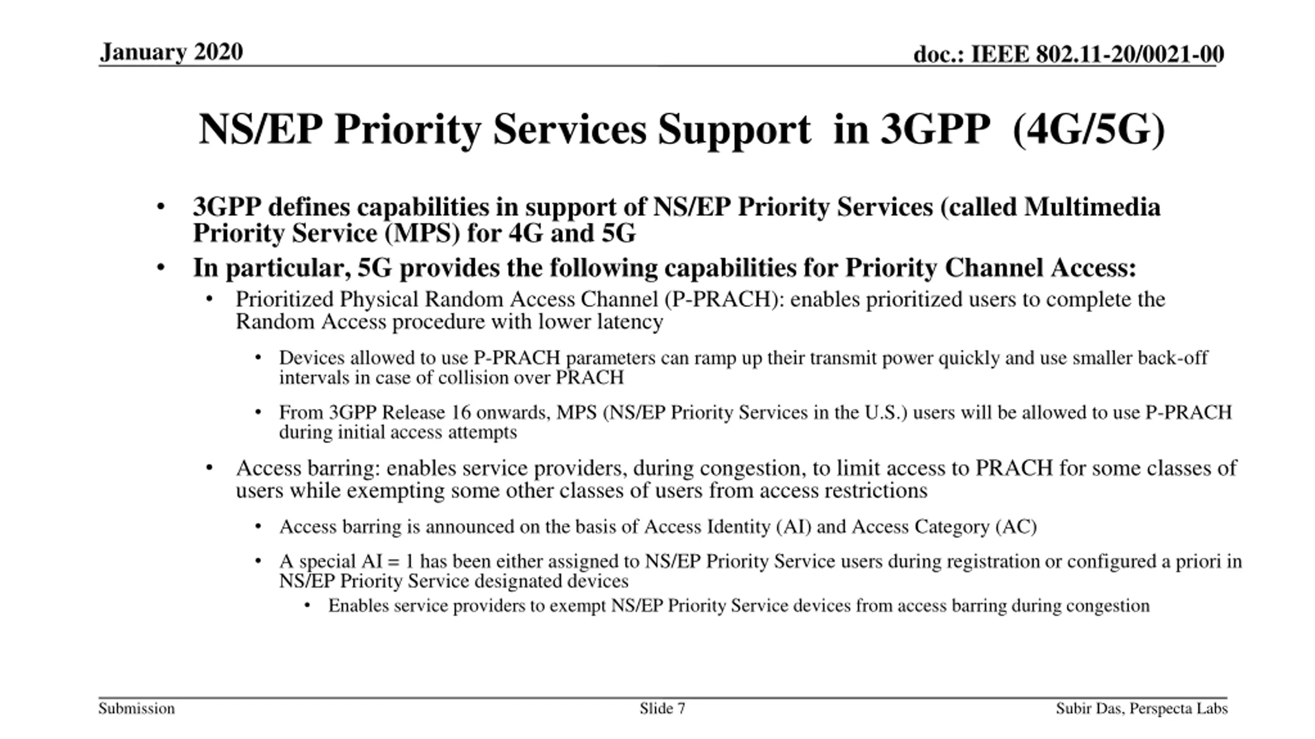 January 2020 doc.: IEEE 802.11-20/0021-00 NS/EP Priority Services NS/EP Priority Services are NOT the Emergency Services (e.g., E911 in US, 112, 110, 999, etc. in Europe) that are normally available to every citizen for emergency calling NS/EP Priority Services in US are government authorized services: Government Emergency Telecommunication Service (GETS), Wireless Priority Service (WPS) and Next Generation Network Priority Service Services enable authorized users to gain priority access to communication network resources in support of their NS/EP mission activities NS/EP Priority Services are deployed by the operators using commercial network infrastructure and enabled through global standards No unauthenticated and unauthorized user is permitted to use the NS/EP Priority Services Submission Slide 6 Subir Das, Perspecta Labs