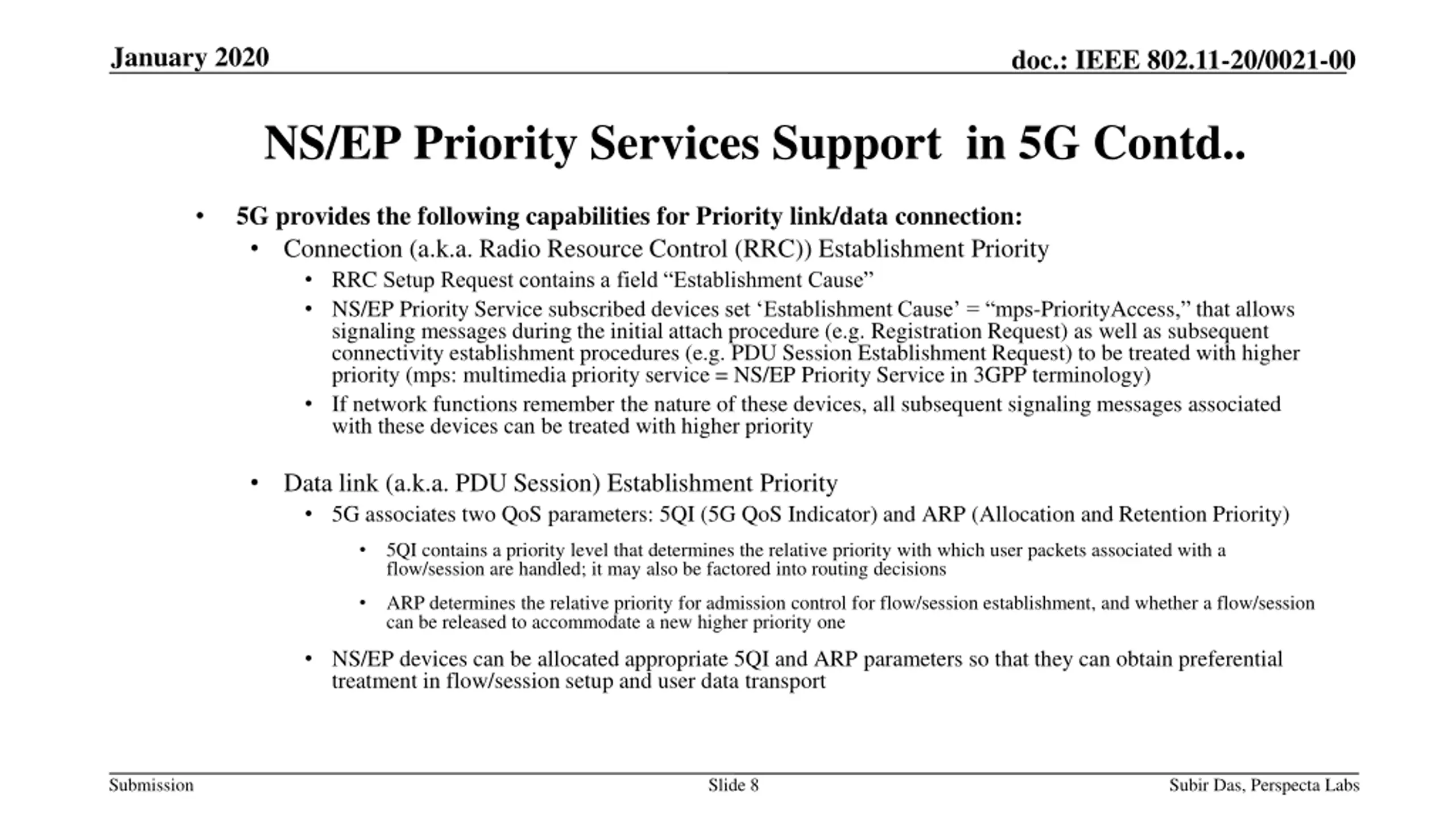 January 2020 doc.: IEEE 802.11-20/0021-00 NS/EP Priority Services Support in 3GPP (4G/5G) 3GPP defines capabilities in support of NS/EP Priority Services (called Multimedia Priority Service (MPS) for 4G and 5G In particular, 5G provides the following capabilities for Priority Channel Access: Prioritized Physical Random Access Channel (P-PRACH): enables prioritized users to complete the Random Access procedure with lower latency Devices allowed to use P-PRACH parameters can ramp up their transmit power quickly and use smaller back-off intervals in case of collision over PRACH From 3GPP Release 16 onwards, MPS (NS/EP Priority Services in the U.S.) users will be allowed to use P-PRACH during initial access attempts Access barring: enables service providers, during congestion, to limit access to PRACH for some classes of users while exempting some other classes of users from access restrictions Access barring is announced on the basis of Access Identity (AI) and Access Category (AC) A special AI = 1 has been either assigned to NS/EP Priority Service users during registration or configured a priori in NS/EP Priority Service designated devices Enables service providers to exempt NS/EP Priority Service devices from access barring during congestion Submission Slide 7 Subir Das, Perspecta Labs