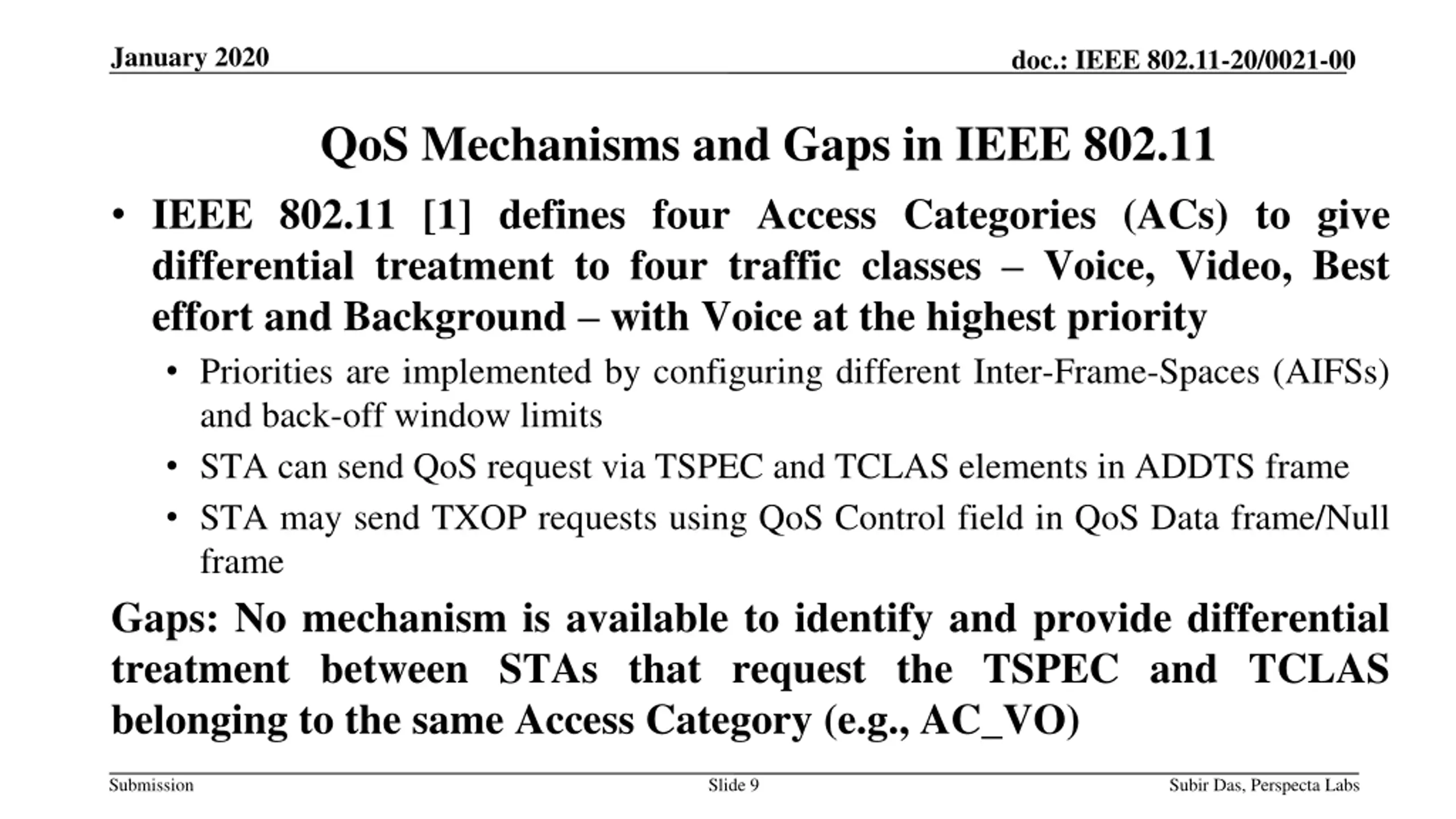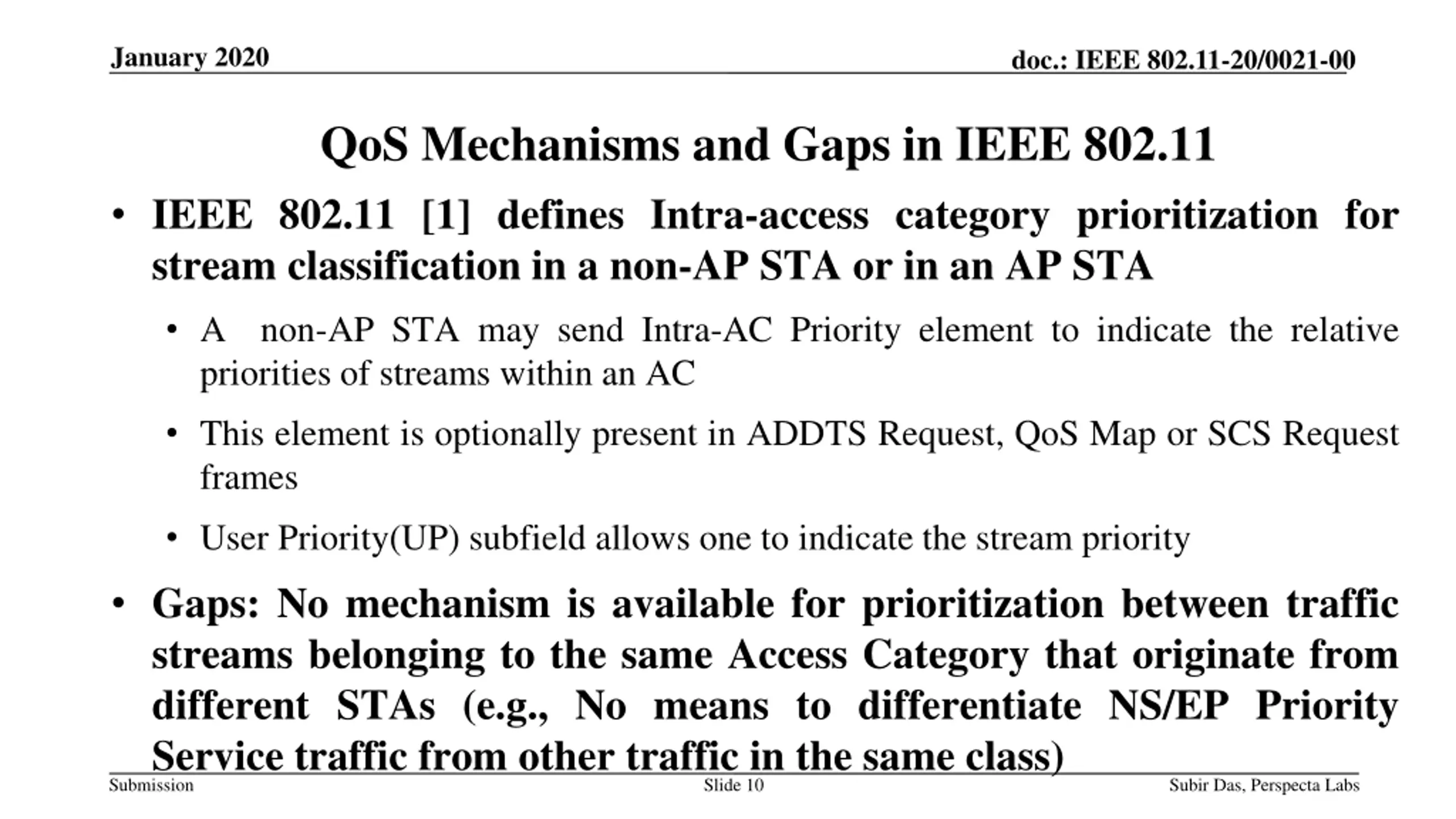 January 2020 doc.: IEEE 802.11-20/0021-00 QoS Mechanisms and Gaps in IEEE 802.11 IEEE 802.11 [1] defines four Access Categories (ACs) to give differential treatment to four traffic classes Voice, Video, Best effort and Background with Voice at the highest priority Priorities are implemented by configuring different Inter-Frame-Spaces (AIFSs) and back-off window limits STA can send QoS request via TSPEC and TCLAS elements in ADDTS frame STA may send TXOP requests using QoS Control field in QoS Data frame/Null frame Gaps: No mechanism is available to identify and provide differential treatment between STAs that request the TSPEC and TCLAS belonging to the same Access Category (e.g., AC_VO) Submission Slide 9 Subir Das, Perspecta Labs