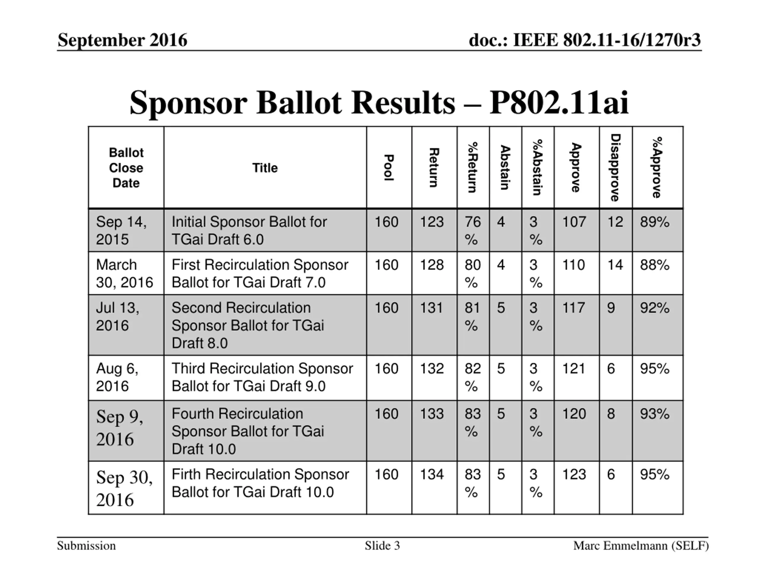 September 2016 doc.: IEEE 802.11-16/1270r3 Sponsor Ballot Results P802.11ai Disapprove %Approve %Abstain %Return Approve Abstain Ballot Close Date Return Pool Title Sep 14, 2015 Initial Sponsor Ballot for TGai Draft 6.0 160 123 76 % 4 3 % 107 12 89% March 30, 2016 First Recirculation Sponsor Ballot for TGai Draft 7.0 160 128 80 % 4 3 % 110 14 88% Jul 13, 2016 Second Recirculation Sponsor Ballot for TGai Draft 8.0 160 131 81 % 5 3 % 117 9 92% Aug 6, 2016 Third Recirculation Sponsor Ballot for TGai Draft 9.0 160 132 82 % 5 3 % 121 6 95% Fourth Recirculation Sponsor Ballot for TGai Draft 10.0 160 133 83 % 5 3 % 120 8 93% Sep 9, 2016 Firth Recirculation Sponsor Ballot for TGai Draft 10.0 160 134 83 % 5 3 % 123 6 95% Sep 30, 2016 Submission Slide 3 Marc Emmelmann (SELF)