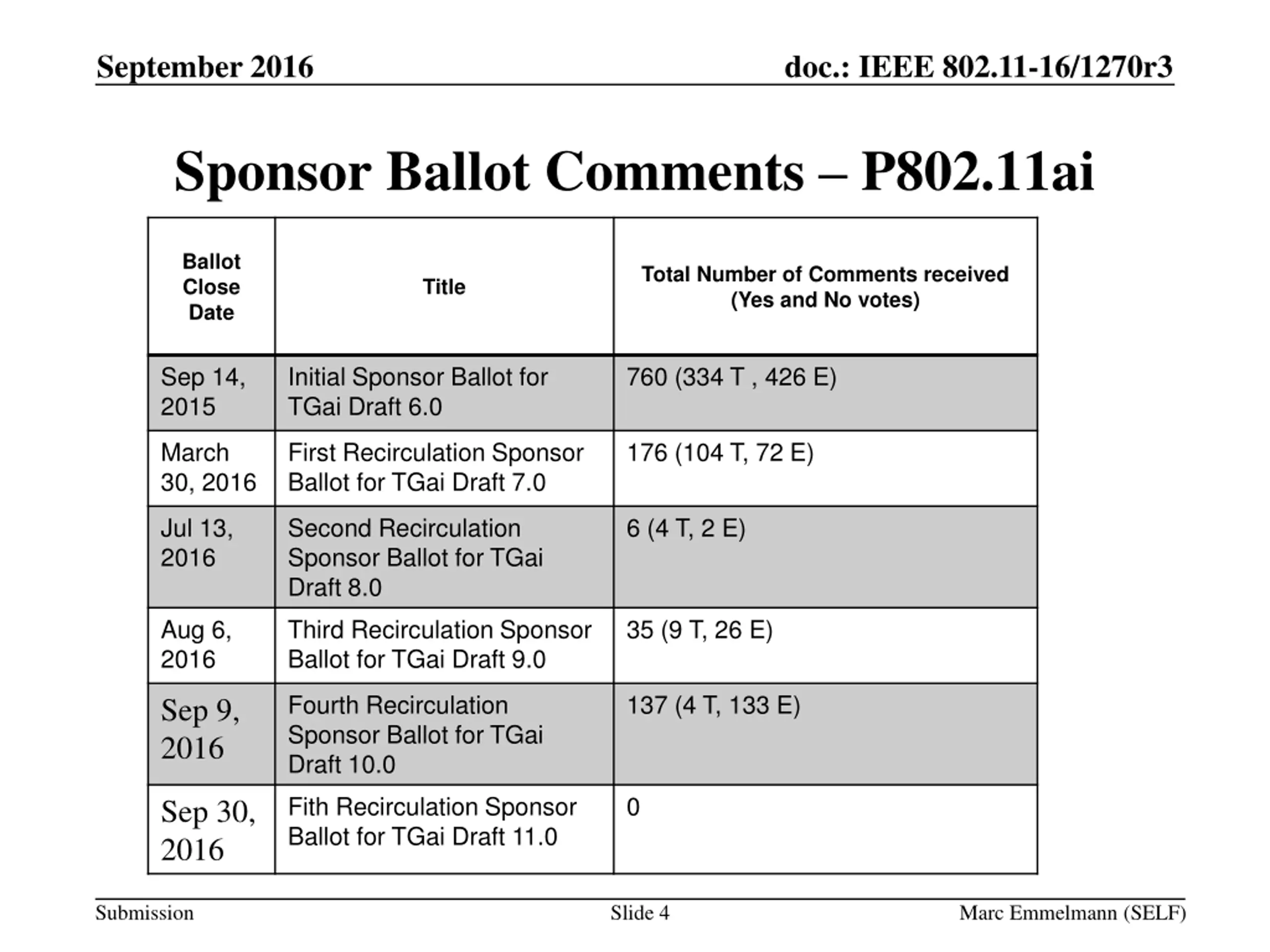 September 2016 doc.: IEEE 802.11-16/1270r3 Sponsor Ballot Comments P802.11ai Ballot Close Date Total Number of Comments received (Yes and No votes) Title Sep 14, 2015 Initial Sponsor Ballot for TGai Draft 6.0 760 (334 T , 426 E) March 30, 2016 First Recirculation Sponsor Ballot for TGai Draft 7.0 176 (104 T, 72 E) Jul 13, 2016 Second Recirculation Sponsor Ballot for TGai Draft 8.0 6 (4 T, 2 E) Aug 6, 2016 Third Recirculation Sponsor Ballot for TGai Draft 9.0 35 (9 T, 26 E) Fourth Recirculation Sponsor Ballot for TGai Draft 10.0 137 (4 T, 133 E) Sep 9, 2016 Fith Recirculation Sponsor Ballot for TGai Draft 11.0 0 Sep 30, 2016 Submission Slide 4 Marc Emmelmann (SELF)