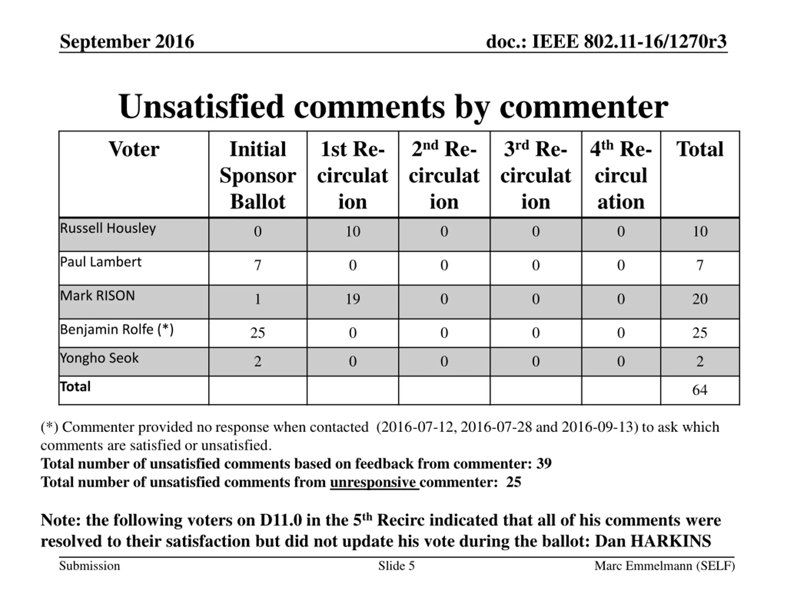September 2016 doc.: IEEE 802.11-16/1270r3 Unsatisfied comments by commenter Voter Initial Sponsor Ballot ion 1st Re- circulat 2nd Re- circulat ion 3rd Re- circulat ion 4th Re- circul ation Total Russell Housley 0 10 0 0 0 10 Paul Lambert 7 0 0 0 0 7 Mark RISON 1 19 0 0 0 20 Benjamin Rolfe (*) 25 0 0 0 0 25 Yongho Seok 2 0 0 0 0 2 Total 64 (*) Commenter provided no response when contacted (2016-07-12, 2016-07-28 and 2016-09-13) to ask which comments are satisfied or unsatisfied. Total number of unsatisfied comments based on feedback from commenter: 39 Total number of unsatisfied comments from unresponsive commenter: 25 Note: the following voters on D11.0 in the 5th Recirc indicated that all of his comments were resolved to their satisfaction but did not update his vote during the ballot: Dan HARKINS Submission Slide 5 Marc Emmelmann (SELF)