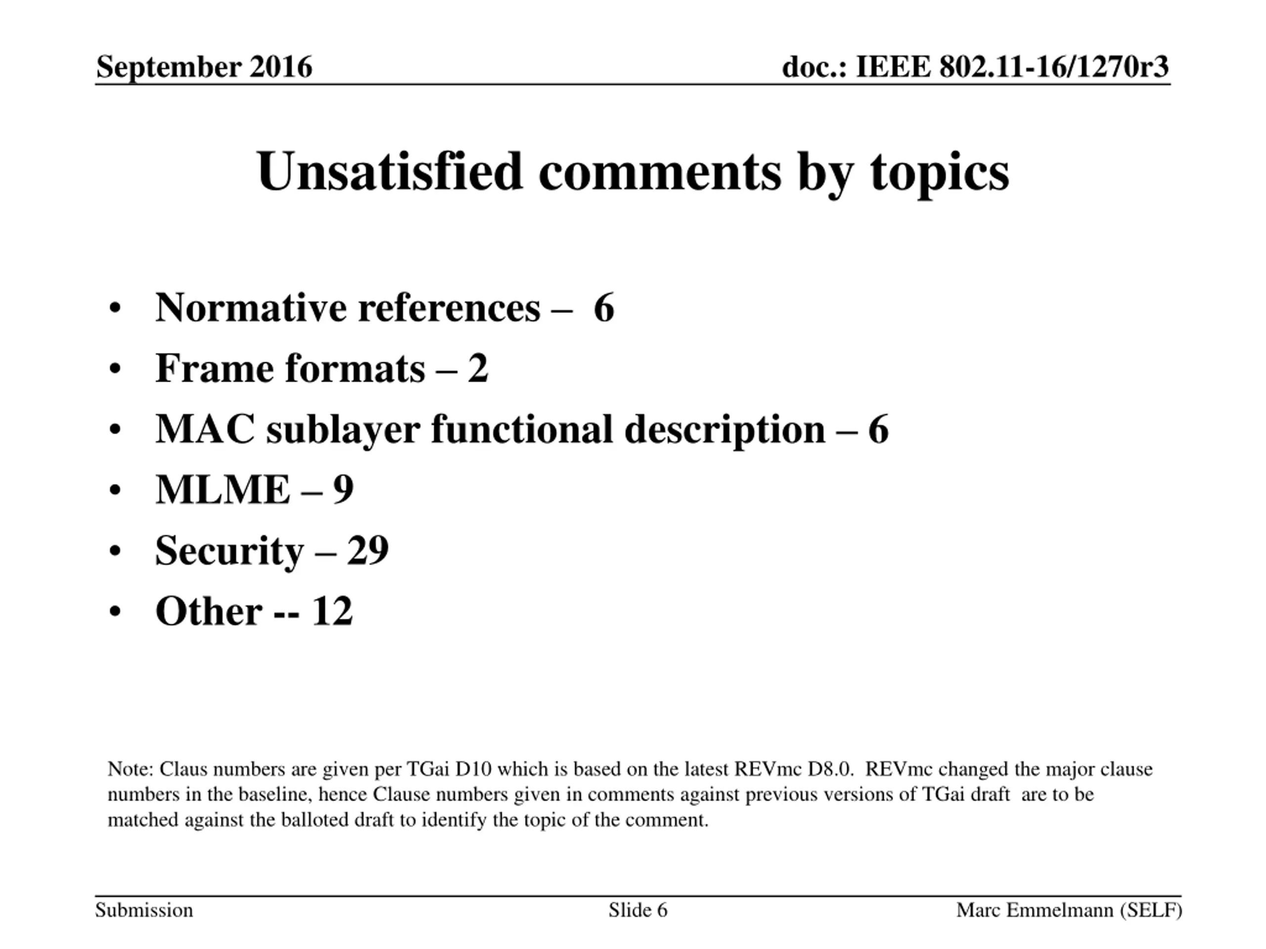 September 2016 doc.: IEEE 802.11-16/1270r3 Unsatisfied comments by topics Normative references 6 Frame formats 2 MAC sublayer functional description 6 MLME 9 Security 29 Other -- 12 Note: Claus numbers are given per TGai D10 which is based on the latest REVmc D8.0. REVmc changed the major clause numbers in the baseline, hence Clause numbers given in comments against previous versions of TGai draft are to be matched against the balloted draft to identify the topic of the comment. Submission Slide 6 Marc Emmelmann (SELF)