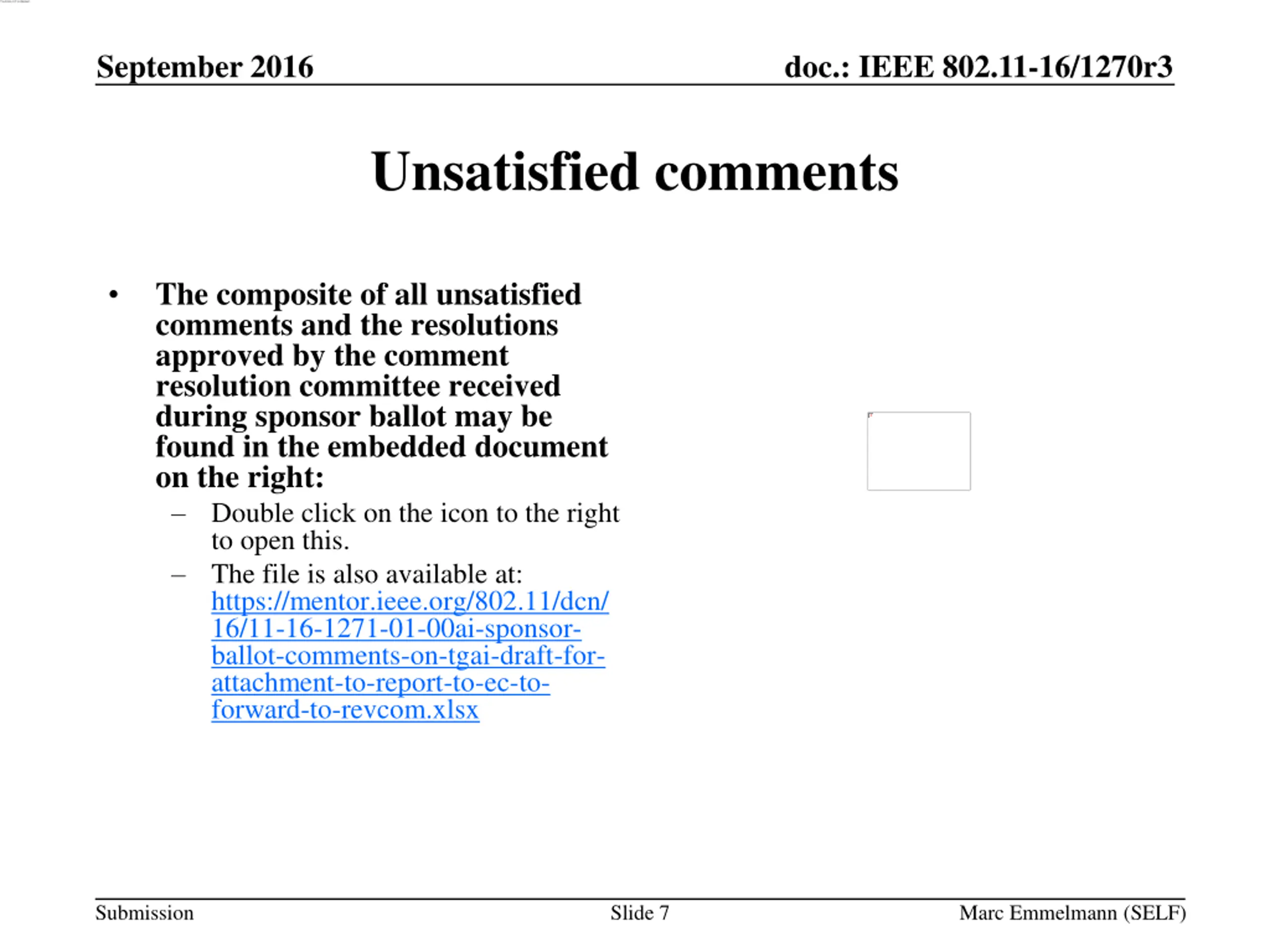 September 2016 doc.: IEEE 802.11-16/1270r3 Unsatisfied comments The composite of all unsatisfied comments and the resolutions approved by the comment resolution committee received during sponsor ballot may be found in the embedded document on the right: Double click on the icon to the right to open this. The file is also available at: https://mentor.ieee.org/802.11/dcn/ 16/11-16-1271-01-00ai-sponsor- ballot-comments-on-tgai-draft-for- attachment-to-report-to-ec-to- forward-to-revcom.xlsx Submission Slide 7 Marc Emmelmann (SELF)