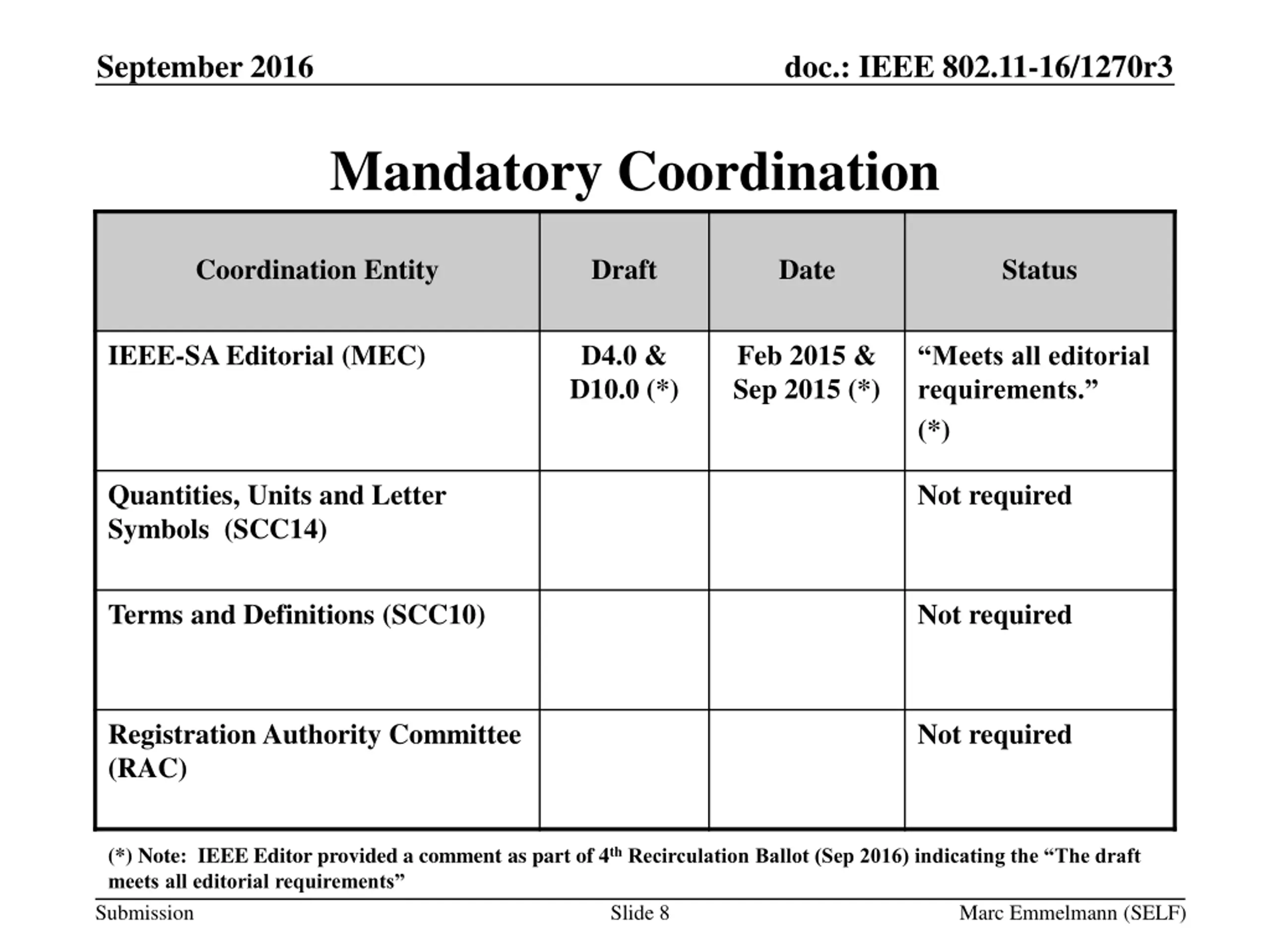 September 2016 doc.: IEEE 802.11-16/1270r3 Mandatory Coordination Coordination Entity Draft Date Status IEEE-SA Editorial (MEC) D4.0 & D10.0 (*) Feb 2015 & Sep 2015 (*) Meets all editorial requirements. (*) Quantities, Units and Letter Symbols (SCC14) Not required Terms and Definitions (SCC10) Not required Registration Authority Committee (RAC) Not required (*) Note: IEEE Editor provided a comment as part of 4thRecirculation Ballot (Sep 2016) indicating the The draft meets all editorial requirements Submission Slide 8 Marc Emmelmann (SELF)