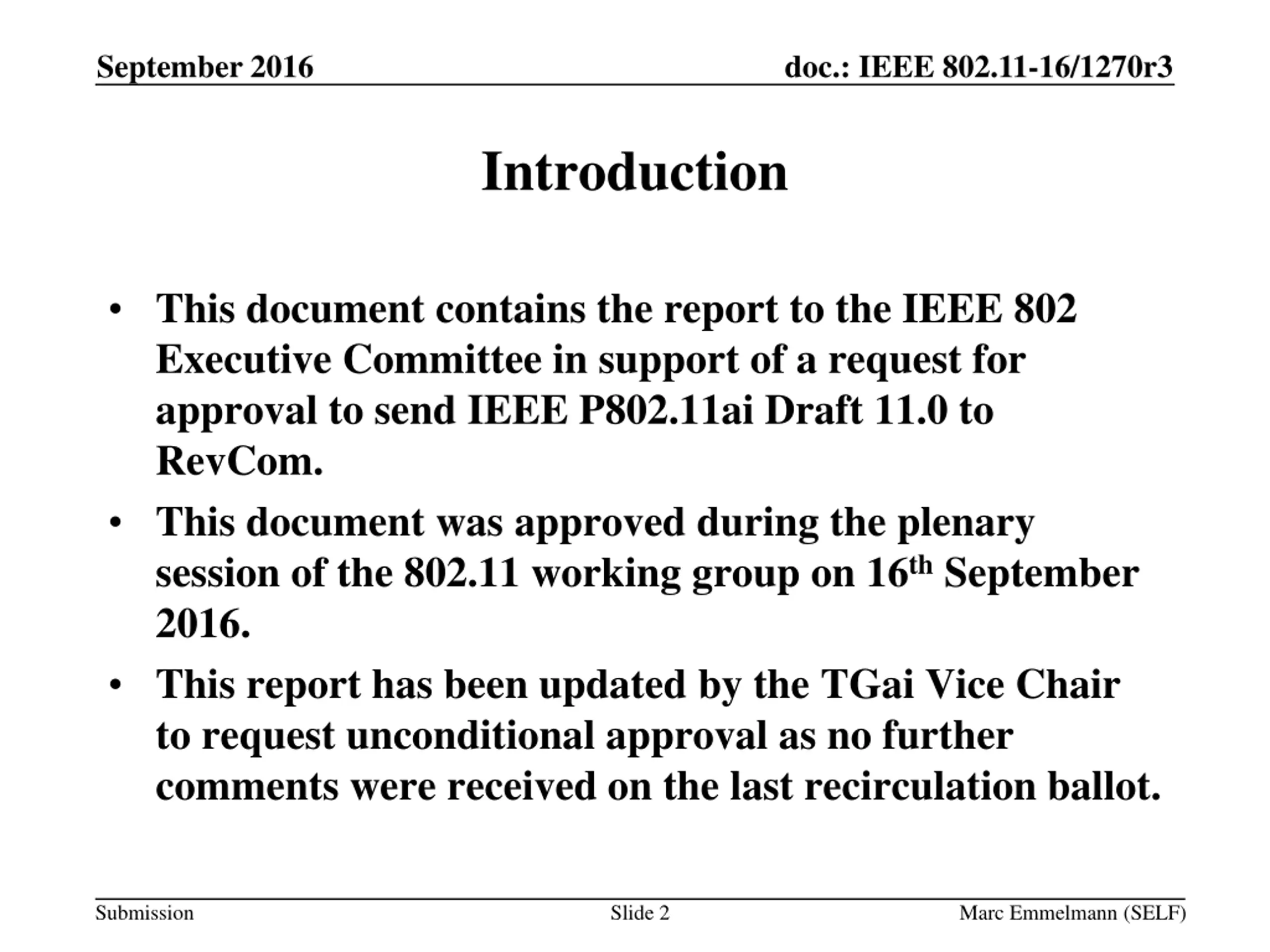 September 2016 doc.: IEEE 802.11-16/1270r3 Introduction This document contains the report to the IEEE 802 Executive Committee in support of a request for approval to send IEEE P802.11ai Draft 11.0 to RevCom. This document was approved during the plenary session of the 802.11 working group on 16th September 2016. This report has been updated by the TGai Vice Chair to request unconditional approval as no further comments were received on the last recirculation ballot. Submission Slide 2 Marc Emmelmann (SELF)