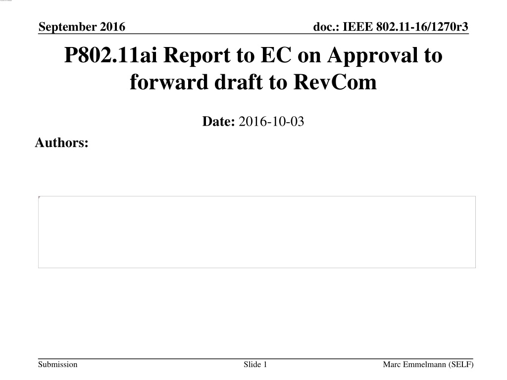 September 2016 P802.11ai Report to EC on Approval to forward draft to RevCom doc.: IEEE 802.11-16/1270r3 Date: 2016-10-03 Authors: Submission Slide 1 Marc Emmelmann (SELF)