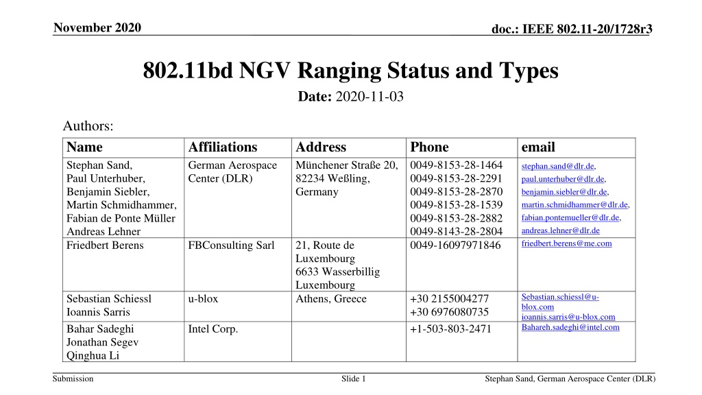 November 2020 doc.: IEEE 802.11-20/1728r3 802.11bd NGV Ranging Status and Types Date: 2020-11-03 Authors: Name Stephan Sand, Paul Unterhuber, Benjamin Siebler, Martin Schmidhammer, Fabian de Ponte M ller Andreas Lehner Friedbert Berens Affiliations German Aerospace Center (DLR) Address M nchener Stra e 20, 82234 We ling, Germany Phone 0049-8153-28-1464 0049-8153-28-2291 0049-8153-28-2870 0049-8153-28-1539 0049-8153-28-2882 0049-8143-28-2804 0049-16097971846 email stephan.sand@dlr.de, paul.unterhuber@dlr.de, benjamin.siebler@dlr.de, martin.schmidhammer@dlr.de, fabian.pontemueller@dlr.de, andreas.lehner@dlr.de friedbert.berens@me.com FBConsulting Sarl 21, Route de Luxembourg 6633 Wasserbillig Luxembourg Athens, Greece Sebastian.schiessl@u- blox.com ioannis.sarris@u-blox.com Bahareh.sadeghi@intel.com Sebastian Schiessl Ioannis Sarris Bahar Sadeghi Jonathan Segev Qinghua Li u-blox +30 2155004277 +30 6976080735 +1-503-803-2471 Intel Corp. Submission Slide 1 Stephan Sand, German Aerospace Center (DLR)