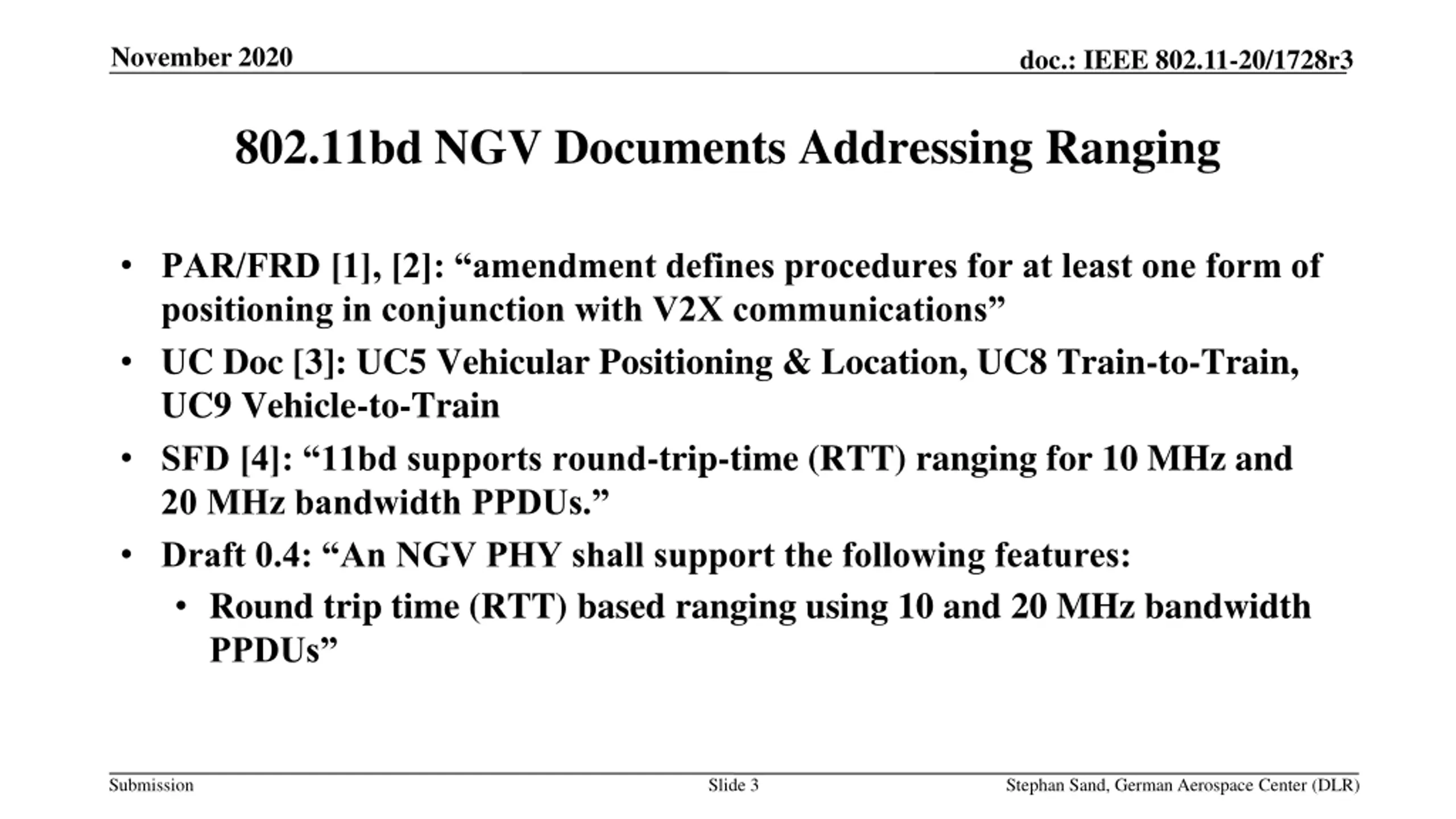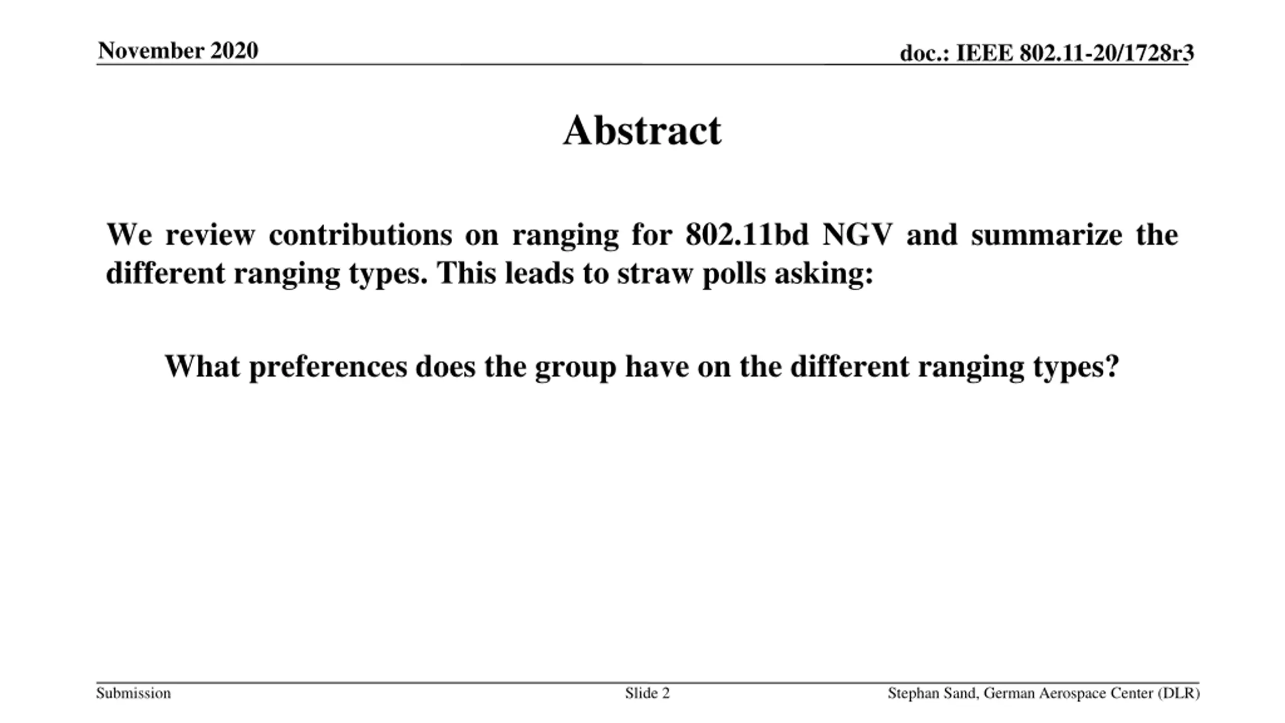 November 2020 doc.: IEEE 802.11-20/1728r3 Abstract We review contributions on ranging for 802.11bd NGV and summarize the different ranging types. This leads to straw polls asking: What preferences does the group have on the different ranging types? Submission Slide 2 Stephan Sand, German Aerospace Center (DLR)