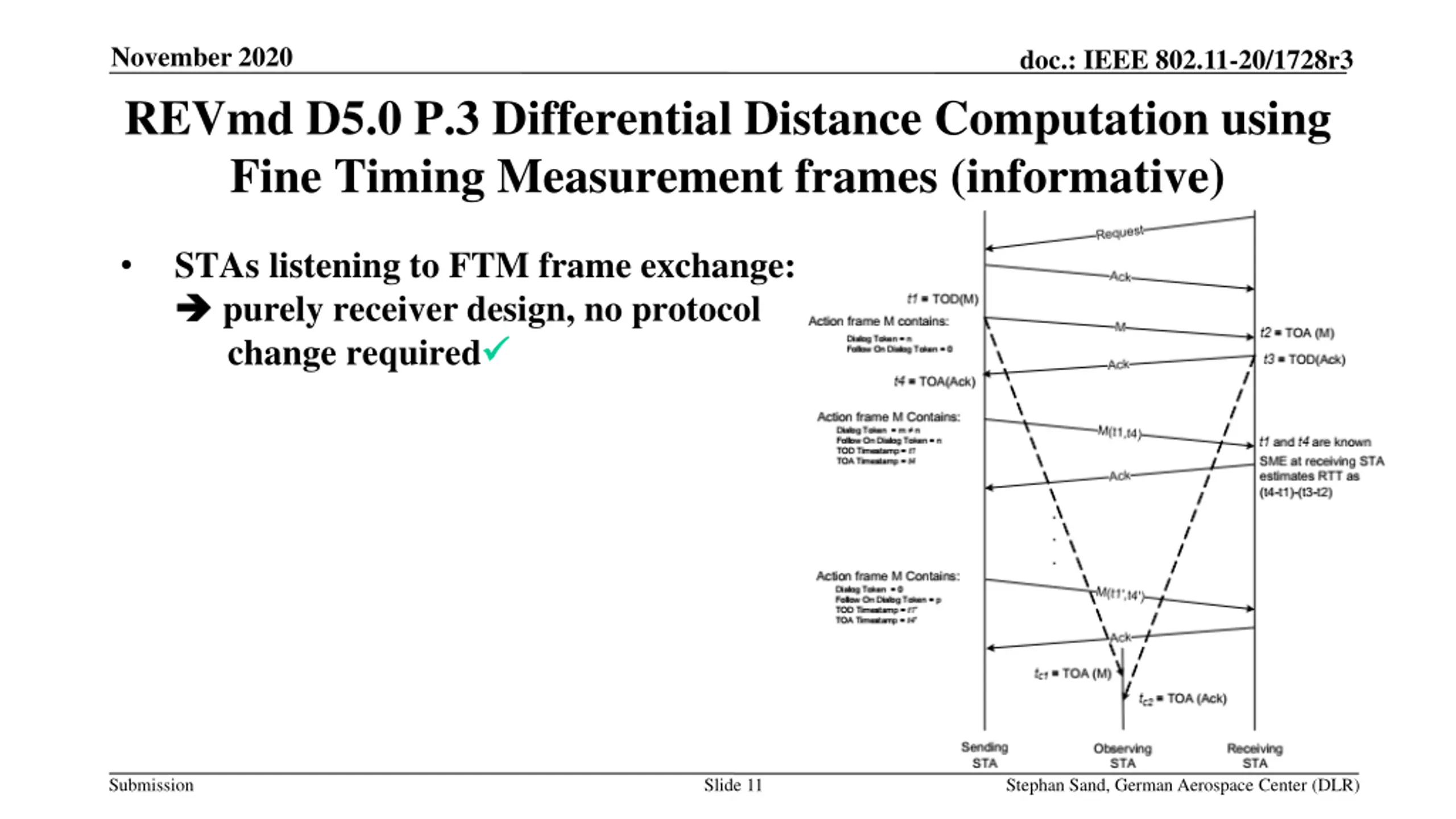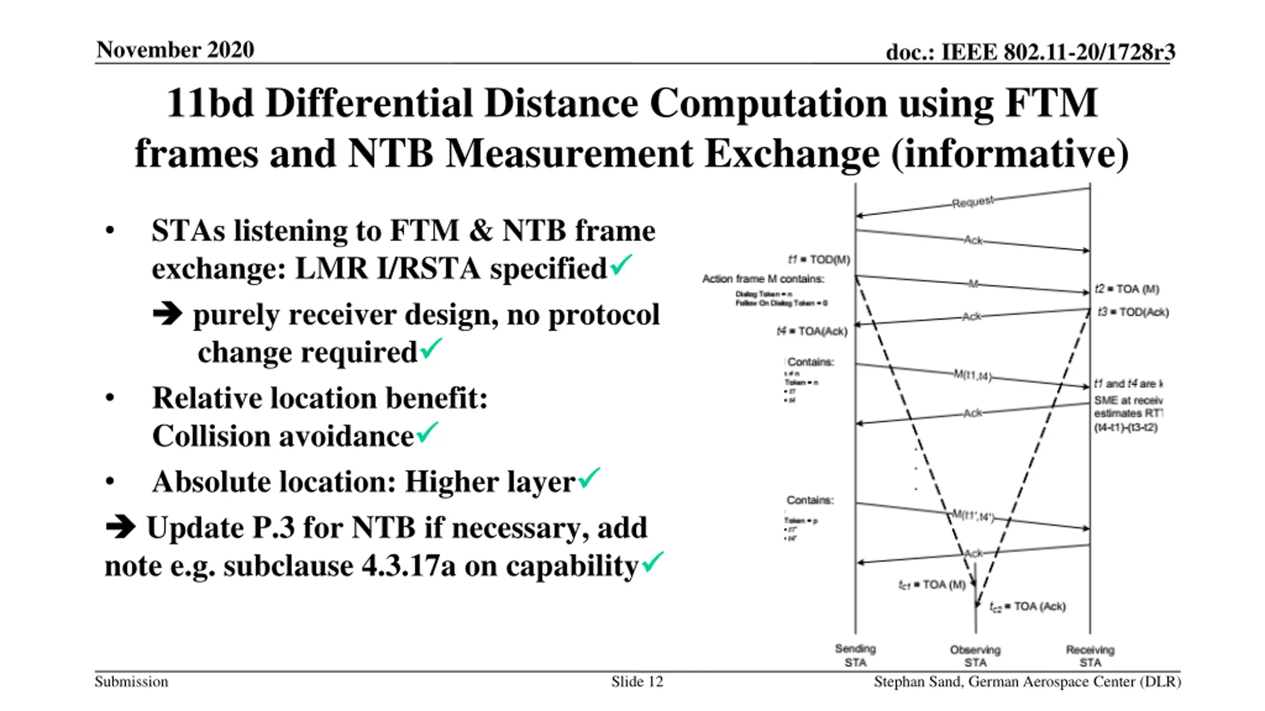 November 2020 doc.: IEEE 802.11-20/1728r3 REVmd D5.0 P.3 Differential Distance Computation using Fine Timing Measurement frames (informative) STAs listening to FTM frame exchange: purely receiver design, no protocol change required Submission Slide 11 Stephan Sand, German Aerospace Center (DLR)