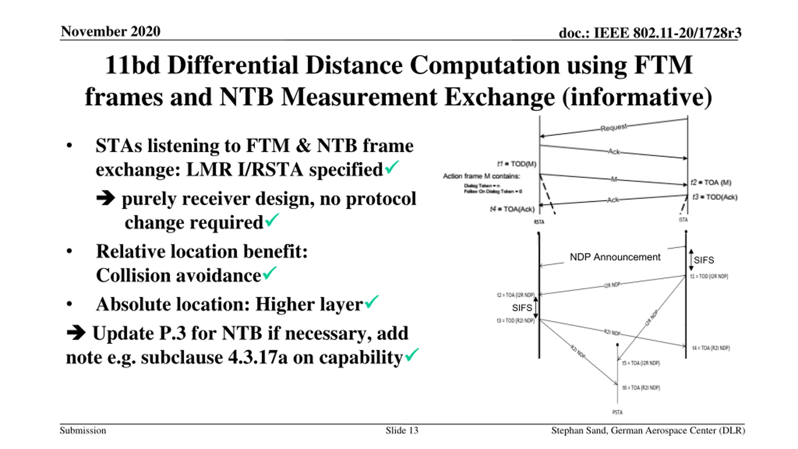 November 2020 doc.: IEEE 802.11-20/1728r3 11bd Differential Distance Computation using FTM frames and NTB Measurement Exchange (informative) STAs listening to FTM & NTB frame exchange: LMR I/RSTA specified purely receiver design, no protocol change required Relative location benefit: Collision avoidance Absolute location: Higher layer Update P.3 for NTB if necessary, add note e.g. subclause 4.3.17a on capability Submission Slide 12 Stephan Sand, German Aerospace Center (DLR)