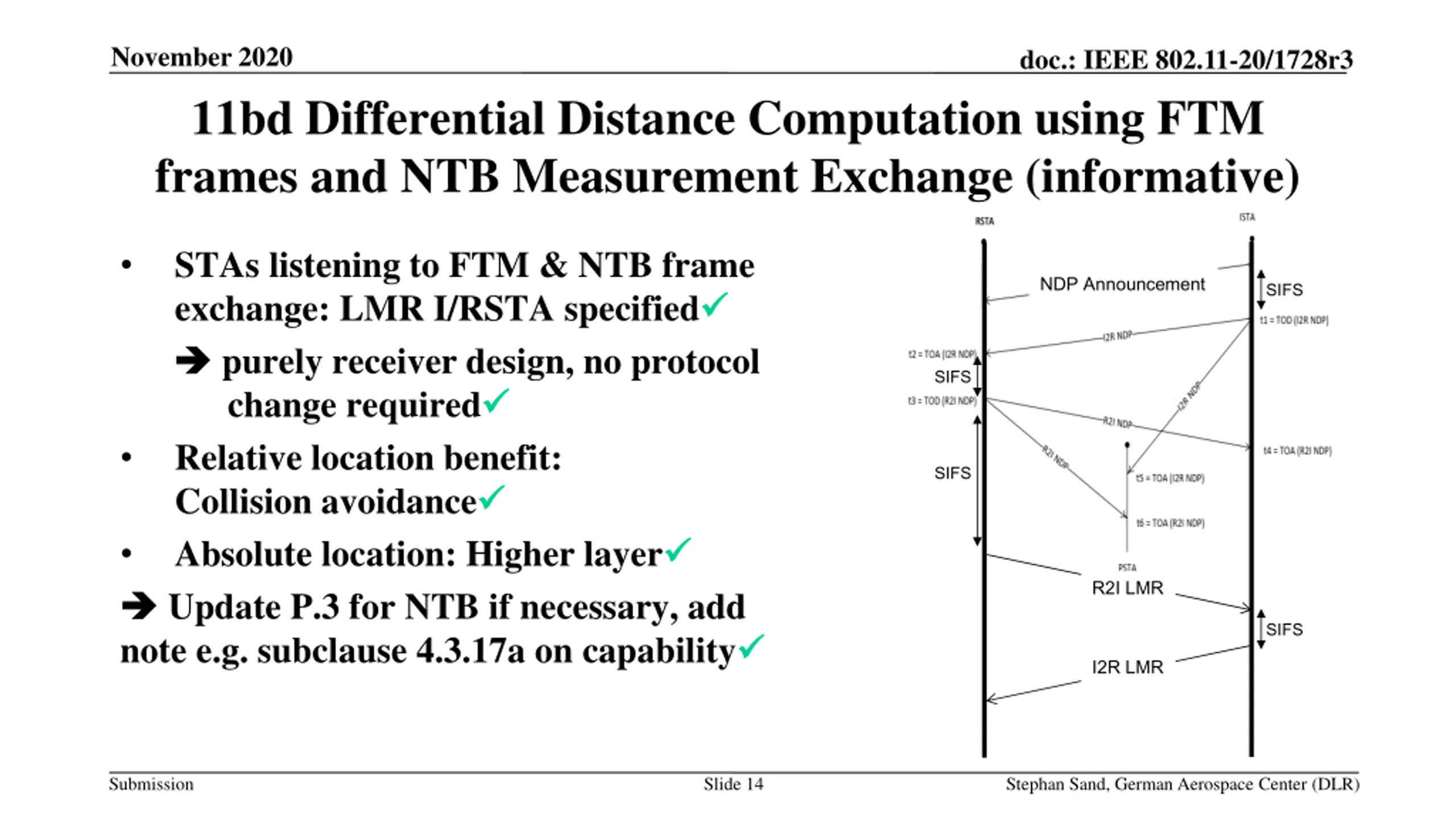 November 2020 doc.: IEEE 802.11-20/1728r3 11bd Differential Distance Computation using FTM frames and NTB Measurement Exchange (informative) STAs listening to FTM & NTB frame exchange: LMR I/RSTA specified purely receiver design, no protocol change required Relative location benefit: Collision avoidance Absolute location: Higher layer Update P.3 for NTB if necessary, add note e.g. subclause 4.3.17a on capability NDP Announcement SIFS SIFS Submission Slide 13 Stephan Sand, German Aerospace Center (DLR)