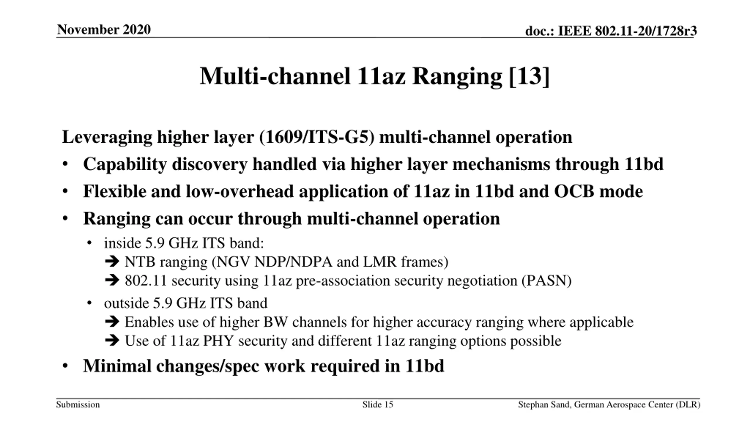 November 2020 doc.: IEEE 802.11-20/1728r3 Multi-channel 11az Ranging [13] Leveraging higher layer (1609/ITS-G5) multi-channel operation Capability discovery handled via higher layer mechanisms through 11bd Flexible and low-overhead application of 11az in 11bd and OCB mode Ranging can occur through multi-channel operation inside 5.9 GHz ITS band: NTB ranging (NGV NDP/NDPA and LMR frames) 802.11 security using 11az pre-association security negotiation (PASN) outside 5.9 GHz ITS band Enables use of higher BW channels for higher accuracy ranging where applicable Use of 11az PHY security and different 11az ranging options possible Minimal changes/spec work required in 11bd Submission Slide 15 Stephan Sand, German Aerospace Center (DLR)