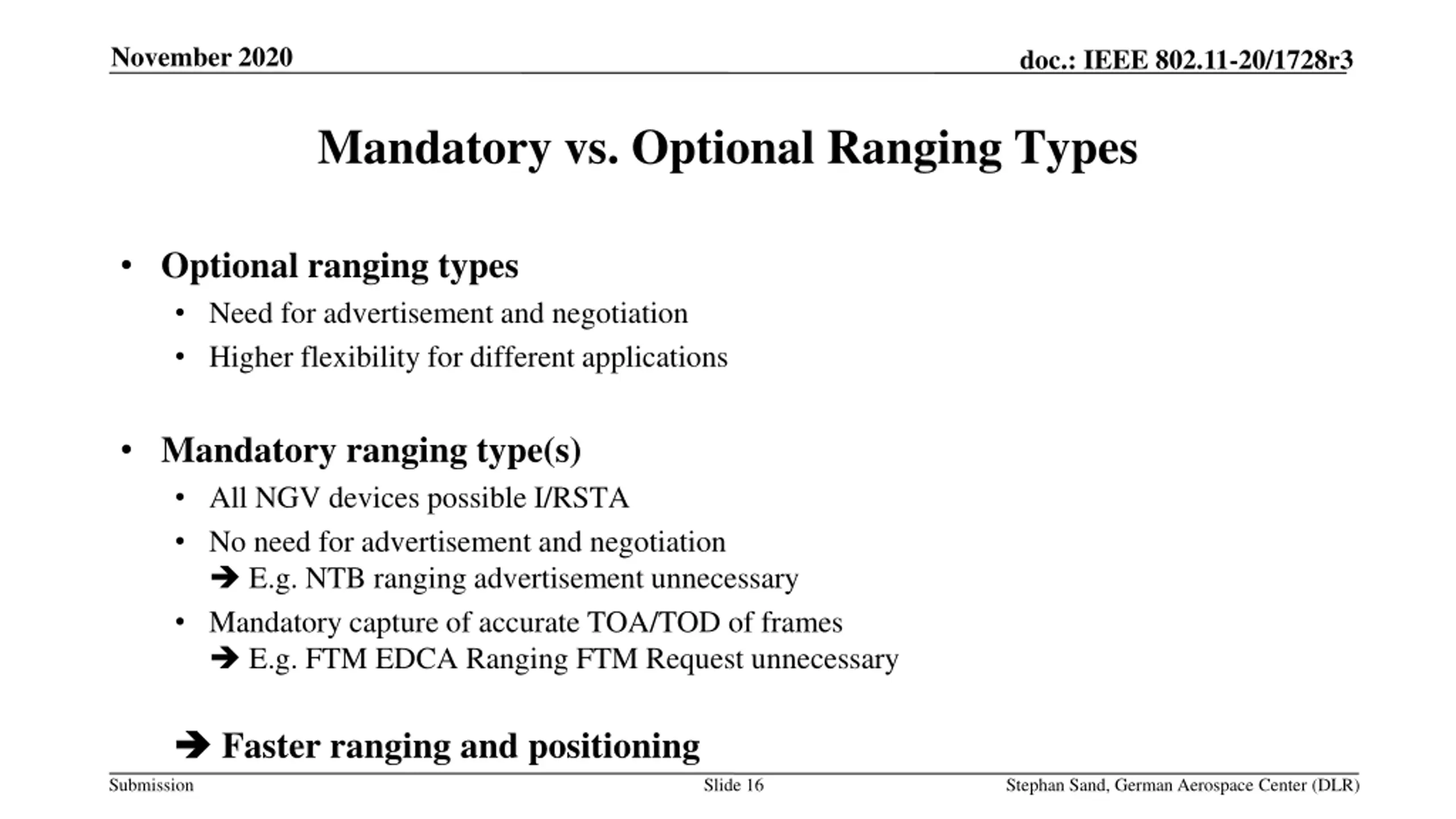 November 2020 doc.: IEEE 802.11-20/1728r3 Mandatory vs. Optional Ranging Types Optional ranging types Need for advertisement and negotiation Higher flexibility for different applications Mandatory ranging type(s) All NGV devices possible I/RSTA No need for advertisement and negotiation E.g. NTB ranging advertisement unnecessary Mandatory capture of accurate TOA/TOD of frames E.g. FTM EDCA Ranging FTM Request unnecessary Faster ranging and positioning Submission Slide 16 Stephan Sand, German Aerospace Center (DLR)