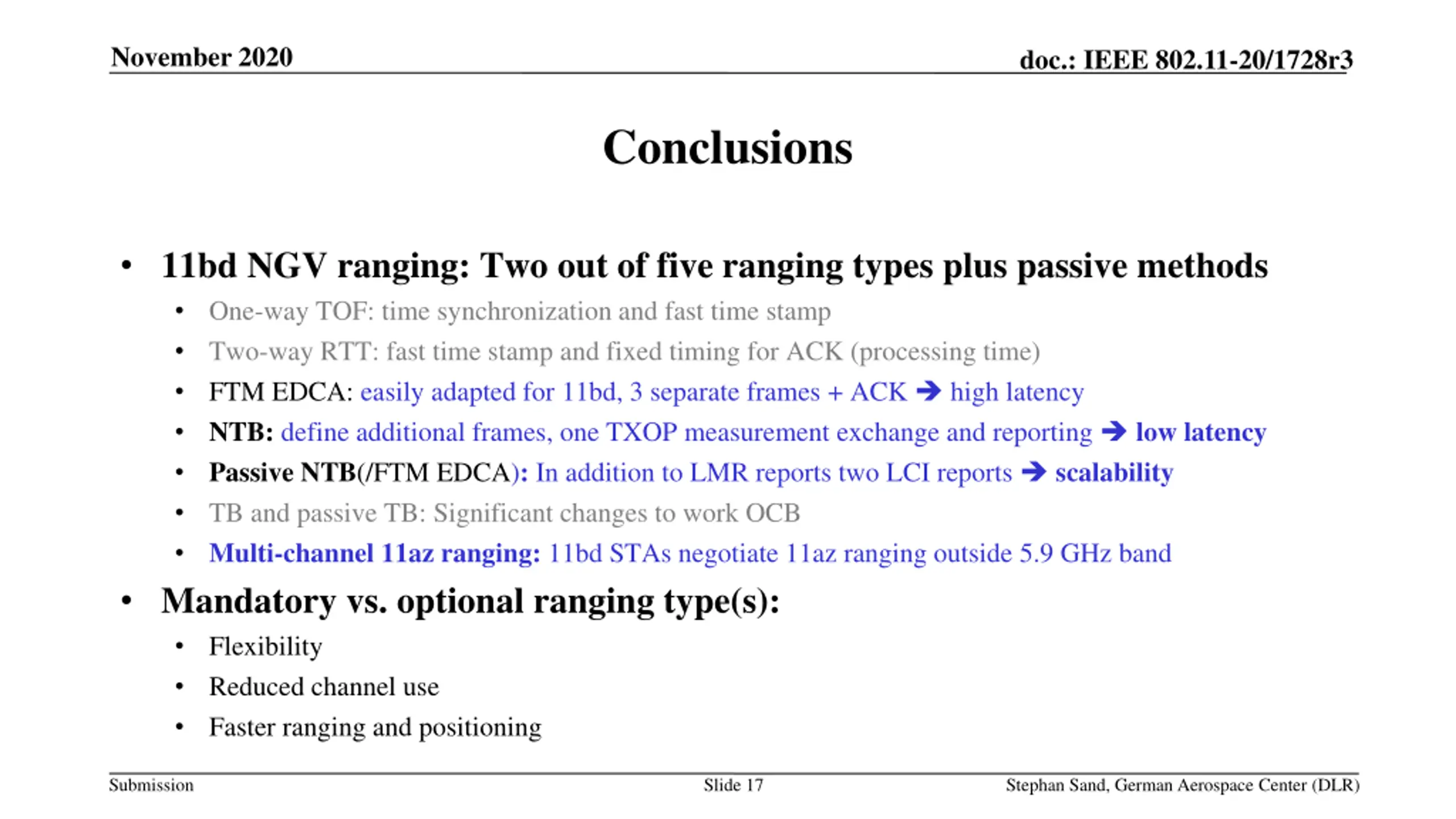 November 2020 doc.: IEEE 802.11-20/1728r3 Conclusions 11bd NGV ranging: Two out of five ranging types plus passive methods One-way TOF: time synchronization and fast time stamp Two-way RTT: fast time stamp and fixed timing for ACK (processing time) FTM EDCA: easily adapted for 11bd, 3 separate frames + ACK high latency NTB: define additional frames, one TXOP measurement exchange and reporting low latency Passive NTB(/FTM EDCA): In addition to LMR reports two LCI reports scalability TB and passive TB: Significant changes to work OCB Multi-channel 11az ranging: 11bd STAs negotiate 11az ranging outside 5.9 GHz band Mandatory vs. optional ranging type(s): Flexibility Reduced channel use Faster ranging and positioning Submission Slide 17 Stephan Sand, German Aerospace Center (DLR)