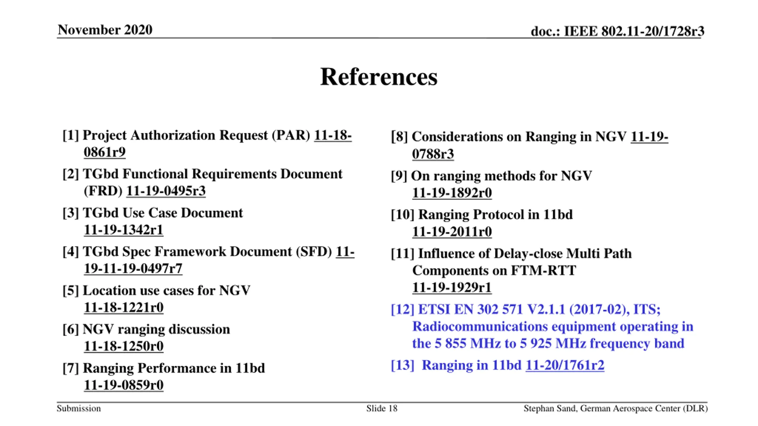 November 2020 doc.: IEEE 802.11-20/1728r3 References [8] Considerations on Ranging in NGV 11-19- 0788r3 [9] On ranging methods for NGV 11-19-1892r0 [10] Ranging Protocol in 11bd 11-19-2011r0 [11] Influence of Delay-close Multi Path Components on FTM-RTT 11-19-1929r1 [12] ETSI EN 302 571 V2.1.1 (2017-02), ITS; Radiocommunications equipment operating in the 5 855 MHz to 5 925 MHz frequency band [13] Ranging in 11bd 11-20/1761r2 [1] Project Authorization Request (PAR) 11-18- 0861r9 [2] TGbd Functional Requirements Document (FRD) 11-19-0495r3 [3] TGbd Use Case Document 11-19-1342r1 [4] TGbd Spec Framework Document (SFD) 11- 19-11-19-0497r7 [5] Location use cases for NGV 11-18-1221r0 [6] NGV ranging discussion 11-18-1250r0 [7] Ranging Performance in 11bd 11-19-0859r0 Submission Slide 18 Stephan Sand, German Aerospace Center (DLR)