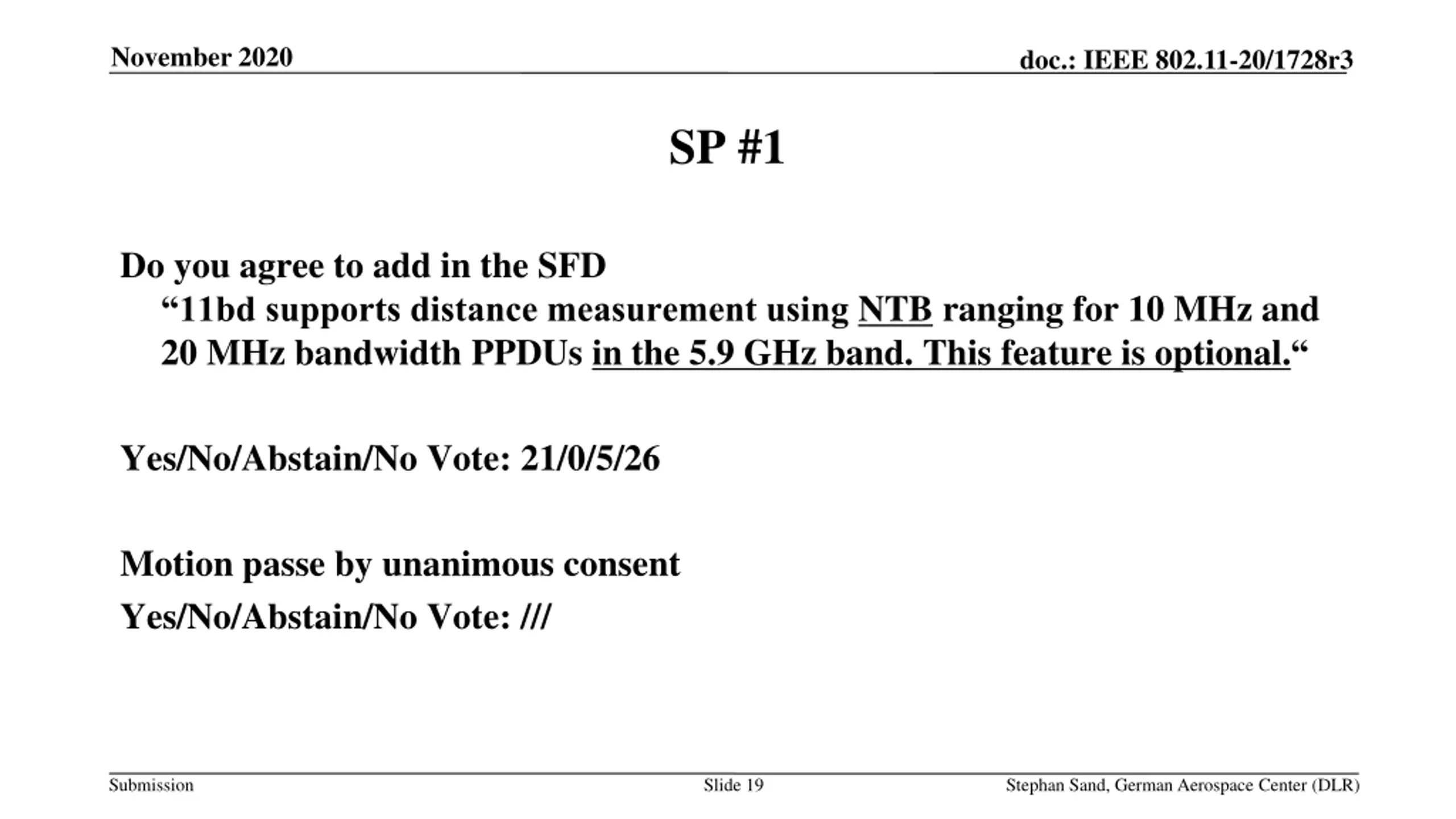November 2020 doc.: IEEE 802.11-20/1728r3 SP #1 Do you agree to add in the SFD 11bd supports distance measurement using NTB ranging for 10 MHz and 20 MHz bandwidth PPDUs in the 5.9 GHz band. This feature is optional. Yes/No/Abstain/No Vote: 21/0/5/26 Motion passe by unanimous consent Yes/No/Abstain/No Vote: /// Submission Slide 19 Stephan Sand, German Aerospace Center (DLR)