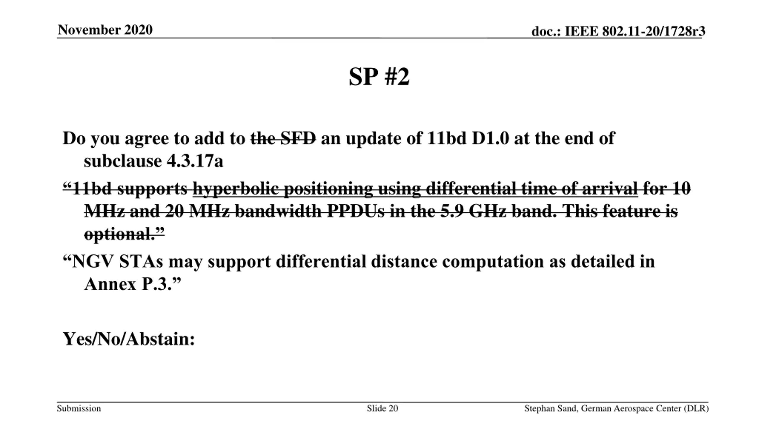 November 2020 doc.: IEEE 802.11-20/1728r3 SP #2 Do you agree to add to the SFD an update of 11bd D1.0 at the end of subclause 4.3.17a 11bd supports hyperbolic positioning using differential time of arrival for 10 MHz and 20 MHz bandwidth PPDUs in the 5.9 GHz band. This feature is optional. NGV STAs may support differential distance computation as detailed in Annex P.3. Yes/No/Abstain: Submission Slide 20 Stephan Sand, German Aerospace Center (DLR)