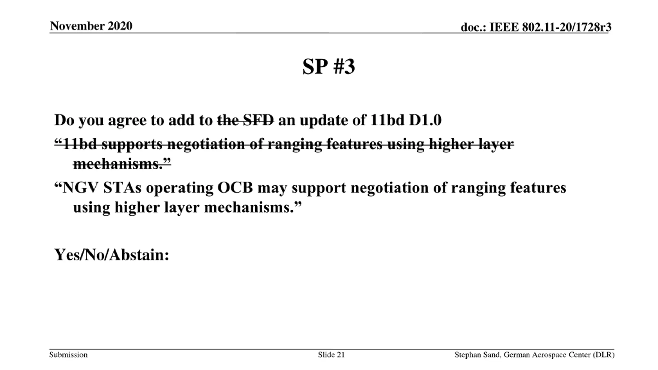 November 2020 doc.: IEEE 802.11-20/1728r3 SP #3 Do you agree to add to the SFD an update of 11bd D1.0 11bd supports negotiation of ranging features using higher layer mechanisms. NGV STAs operating OCB may support negotiation of ranging features using higher layer mechanisms. Yes/No/Abstain: Submission Slide 21 Stephan Sand, German Aerospace Center (DLR)