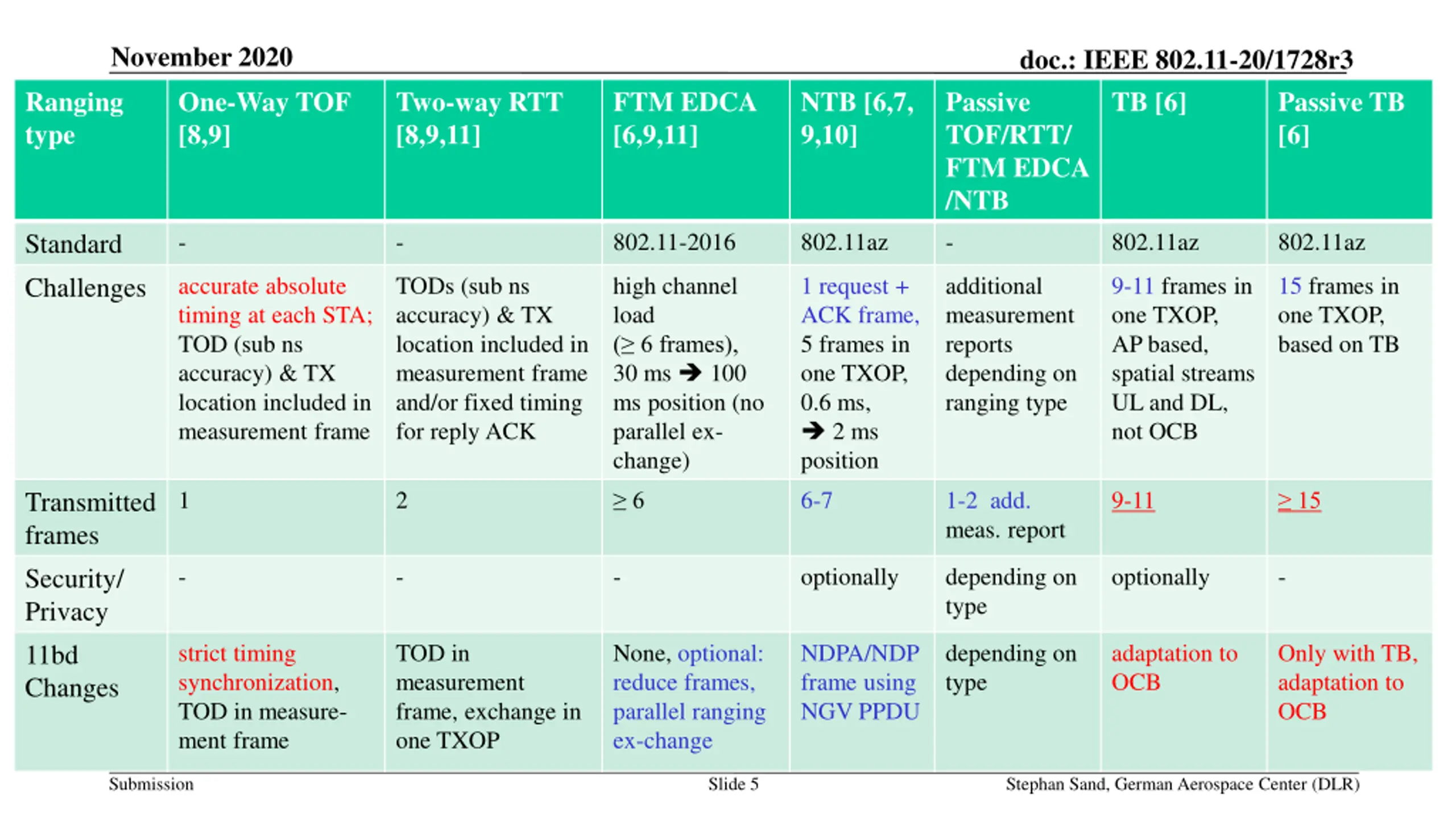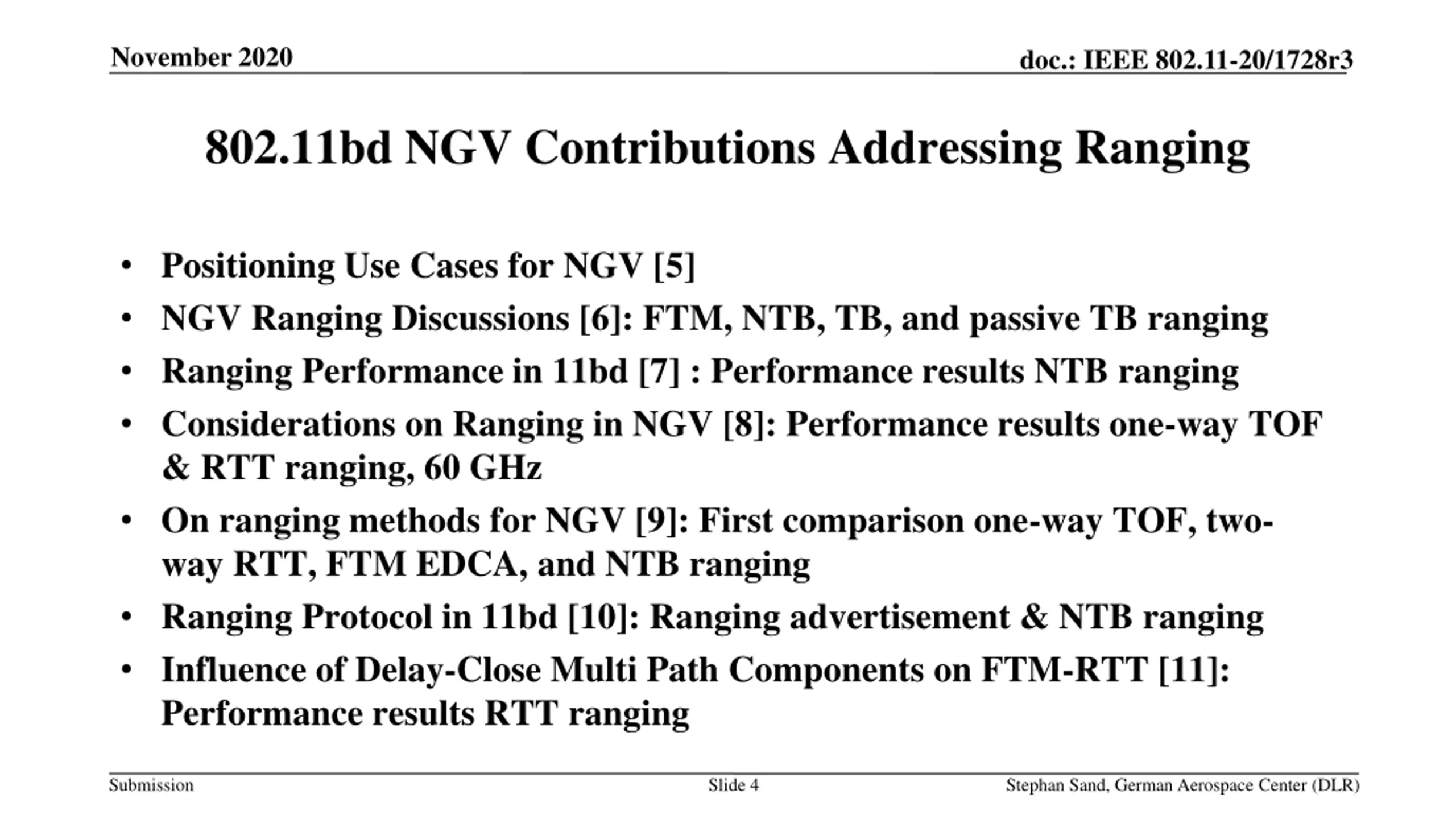 November 2020 doc.: IEEE 802.11-20/1728r3 802.11bd NGV Contributions Addressing Ranging Positioning Use Cases for NGV [5] NGV Ranging Discussions [6]: FTM, NTB, TB, and passive TB ranging Ranging Performance in 11bd [7] : Performance results NTB ranging Considerations on Ranging in NGV [8]: Performance results one-way TOF & RTT ranging, 60 GHz On ranging methods for NGV [9]: First comparison one-way TOF, two- way RTT, FTM EDCA, and NTB ranging Ranging Protocol in 11bd [10]: Ranging advertisement & NTB ranging Influence of Delay-Close Multi Path Components on FTM-RTT [11]: Performance results RTT ranging Submission Slide 4 Stephan Sand, German Aerospace Center (DLR)