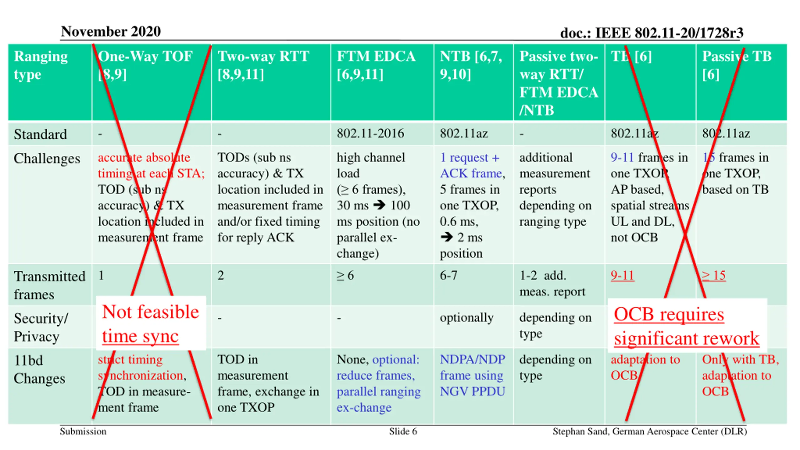 November 2020 doc.: IEEE 802.11-20/1728r3 Passive TOF/RTT/ FTM EDCA /NTB Ranging type One-Way TOF [8,9] Two-way RTT [8,9,11] FTM EDCA [6,9,11] NTB [6,7, 9,10] TB [6] Passive TB [6] - - 802.11-2016 802.11az - 802.11az 802.11az Standard Challenges accurate absolute timing at each STA; TOD (sub ns accuracy) & TX location included in measurement frame TODs (sub ns accuracy) & TX location included in measurement frame and/or fixed timing for reply ACK high channel load ( 6 frames), 30 ms 100 ms position (no parallel ex- change) 1 request + ACK frame, 5 frames in one TXOP, 0.6 ms, 2 ms position additional measurement reports depending on ranging type 9-11 frames in one TXOP, AP based, spatial streams UL and DL, not OCB 15 frames in one TXOP, based on TB 1 2 6-7 1-2 add. meas. report 9-11 Transmitted frames Security/ Privacy 11bd Changes 6 15 - - - optionally depending on type optionally - strict timing synchronization, TOD in measure- ment frame TOD in measurement frame, exchange in one TXOP None, optional: reduce frames, parallel ranging ex-change NDPA/NDP frame using NGV PPDU depending on type adaptation to OCB Only with TB, adaptation to OCB Submission Slide 5 Stephan Sand, German Aerospace Center (DLR)