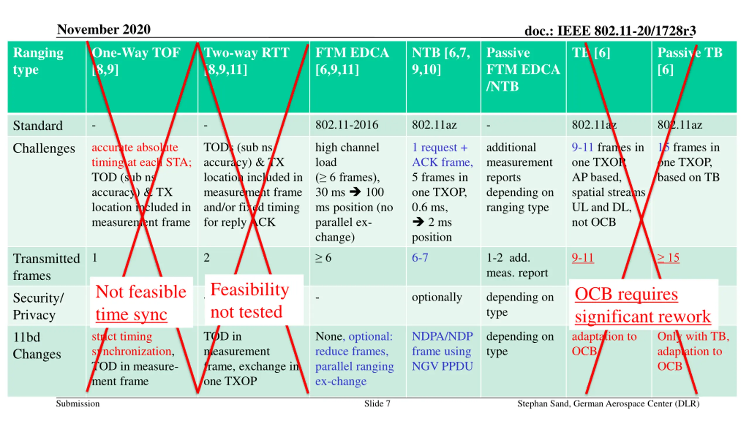 November 2020 doc.: IEEE 802.11-20/1728r3 Passive two- way RTT/ FTM EDCA /NTB Ranging type One-Way TOF [8,9] Two-way RTT [8,9,11] FTM EDCA [6,9,11] NTB [6,7, 9,10] TB [6] Passive TB [6] - - 802.11-2016 802.11az - 802.11az 802.11az Standard Challenges accurate absolute timing at each STA; TOD (sub ns accuracy) & TX location included in measurement frame TODs (sub ns accuracy) & TX location included in measurement frame and/or fixed timing for reply ACK high channel load ( 6 frames), 30 ms 100 ms position (no parallel ex- change) 1 request + ACK frame, 5 frames in one TXOP, 0.6 ms, 2 ms position additional measurement reports depending on ranging type 9-11 frames in one TXOP, AP based, spatial streams UL and DL, not OCB 15 frames in one TXOP, based on TB 1 2 6-7 1-2 add. meas. report 9-11 Transmitted frames Security/ Privacy 11bd Changes 6 15 Not feasible time sync optionally OCB requires significant rework - - - optionally depending on type No strict timing synchronization, TOD in measure- ment frame TOD in measurement frame, exchange in one TXOP None, optional: reduce frames, parallel ranging ex-change NDPA/NDP frame using NGV PPDU depending on type adaptation to OCB Only with TB, adaptation to OCB Submission Slide 6 Stephan Sand, German Aerospace Center (DLR)