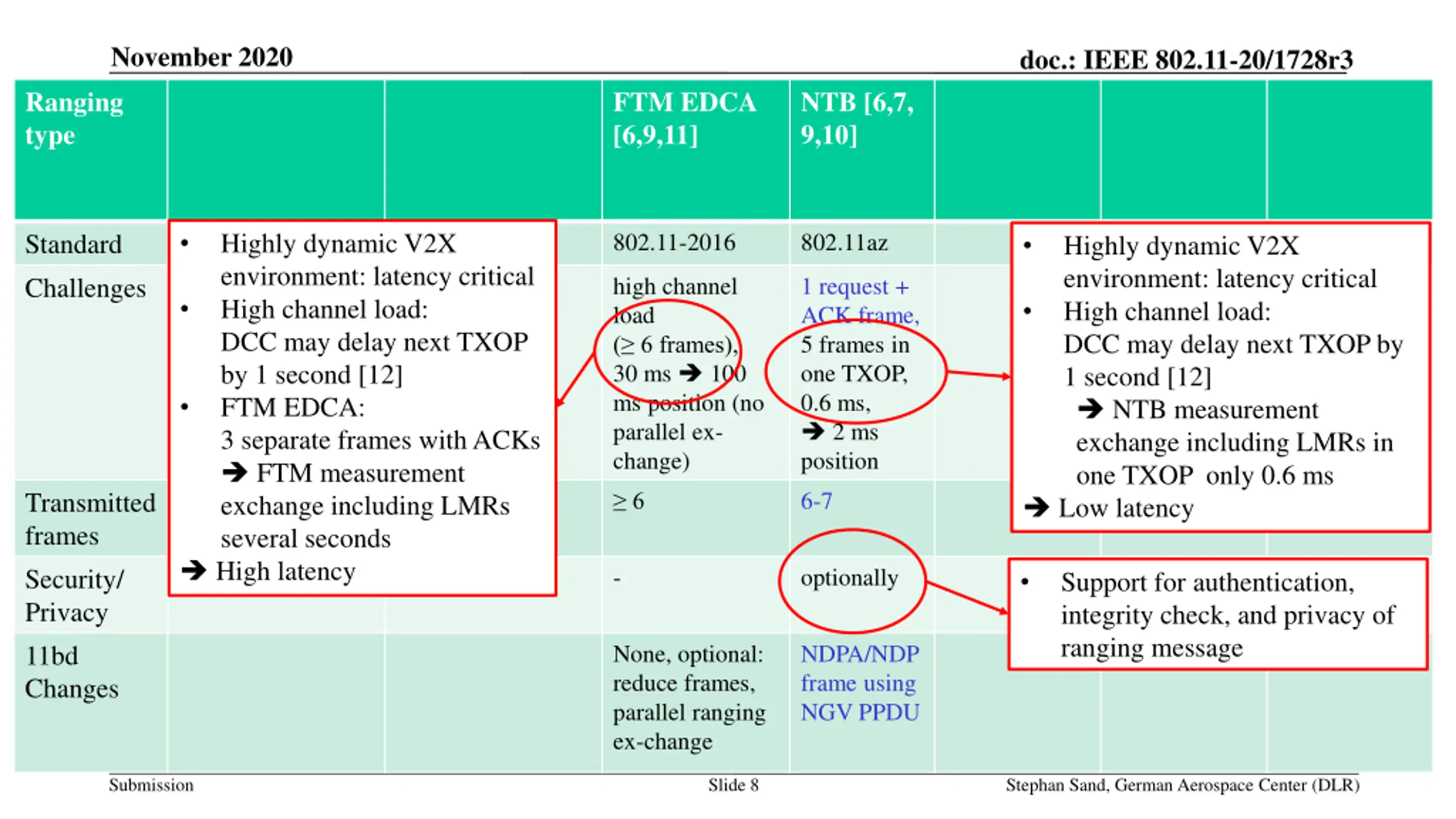 November 2020 doc.: IEEE 802.11-20/1728r3 Ranging type FTM EDCA [6,9,11] NTB [6,7, 9,10] Highly dynamic V2X environment: latency critical High channel load: DCC may delay next TXOP by 1 second [12] FTM EDCA: 3 separate frames with ACKs FTM measurement exchange including LMRs several seconds High latency 802.11-2016 802.11az Standard Challenges Highly dynamic V2X environment: latency critical High channel load: DCC may delay next TXOP by 1 second [12] NTB measurement exchange including LMRs in one TXOP only 0.6 ms Low latency high channel load ( 6 frames), 30 ms 100 ms position (no parallel ex- change) 1 request + ACK frame, 5 frames in one TXOP, 0.6 ms, 2 ms position 6-7 Transmitted frames Security/ Privacy 11bd Changes 6 - optionally Support for authentication, integrity check, and privacy of ranging message None, optional: reduce frames, parallel ranging ex-change NDPA/NDP frame using NGV PPDU Submission Slide 8 Stephan Sand, German Aerospace Center (DLR)