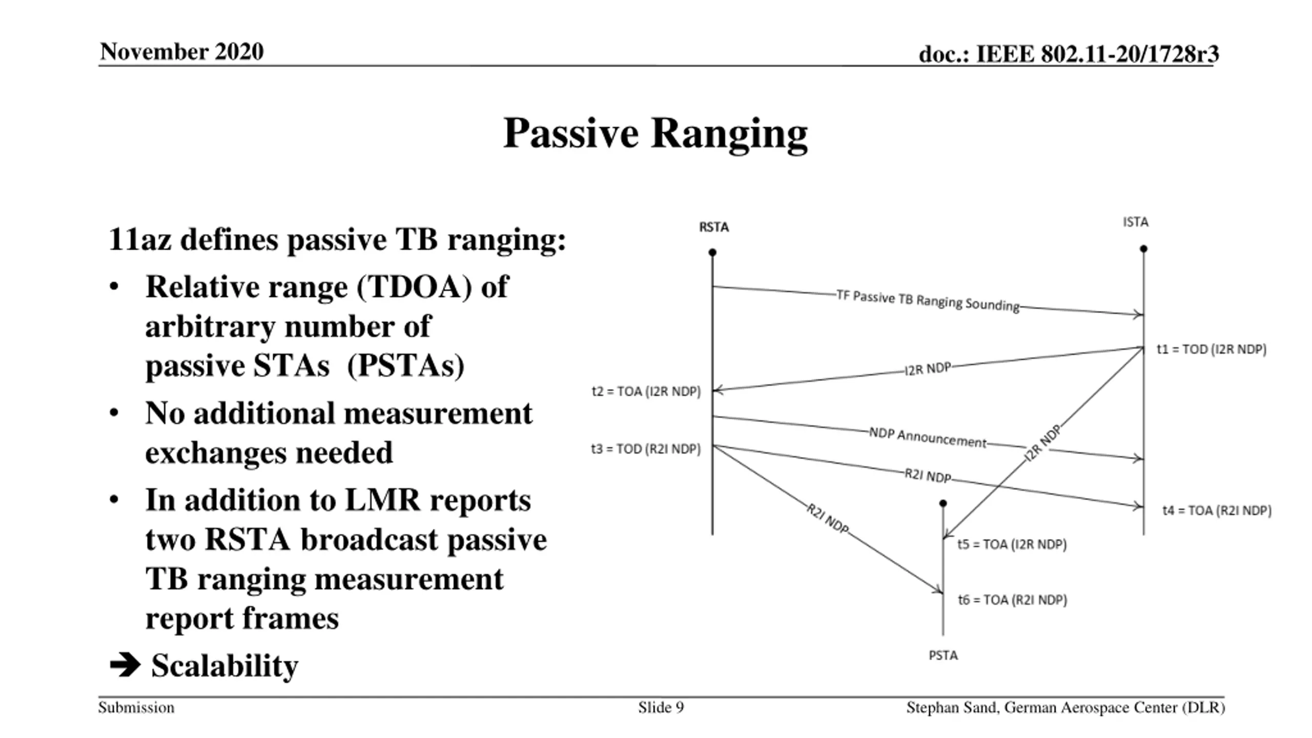 November 2020 doc.: IEEE 802.11-20/1728r3 Passive Ranging 11az defines passive TB ranging: Relative range (TDOA) of arbitrary number of passive STAs (PSTAs) No additional measurement exchanges needed In addition to LMR reports two RSTA broadcast passive TB ranging measurement report frames Scalability Submission Slide 9 Stephan Sand, German Aerospace Center (DLR)
