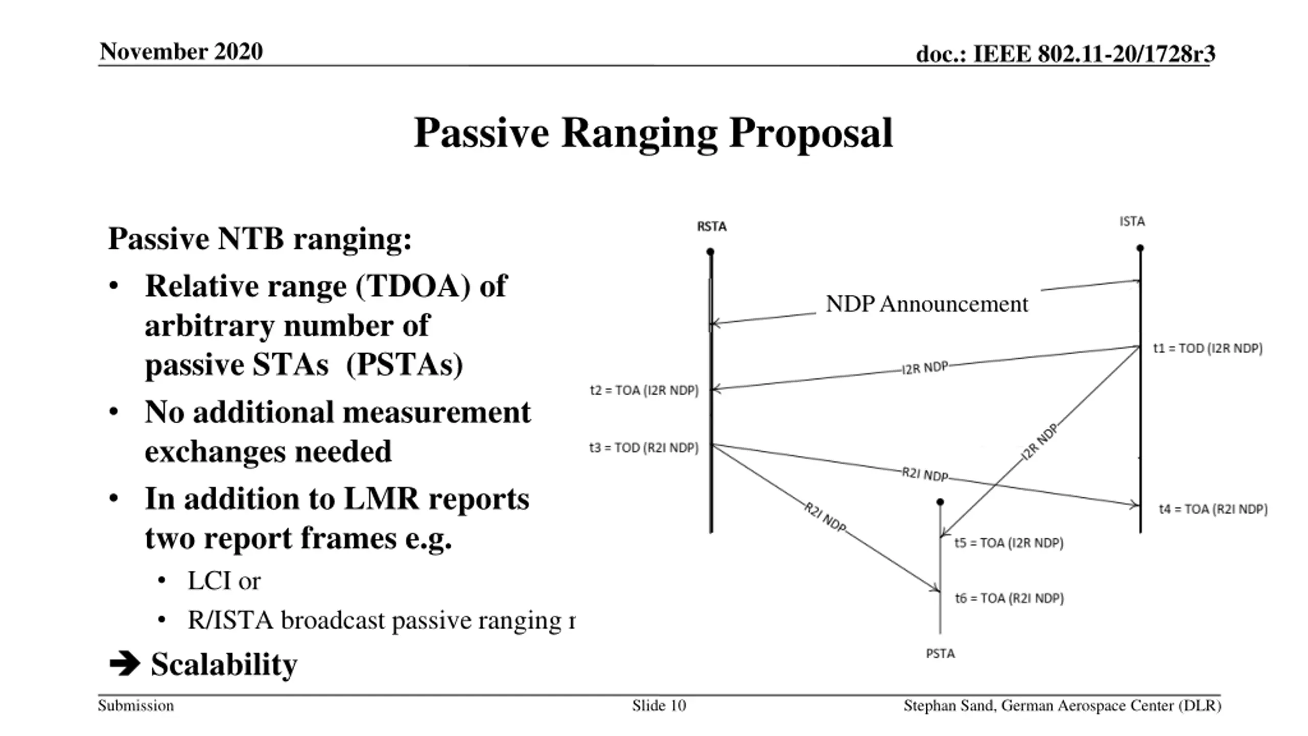 November 2020 doc.: IEEE 802.11-20/1728r3 Passive Ranging Proposal Passive NTB ranging: Relative range (TDOA) of arbitrary number of passive STAs (PSTAs) No additional measurement exchanges needed In addition to LMR reports two report frames e.g. LCI or R/ISTA broadcast passive ranging measurement Scalability NDP Announcement Submission Slide 10 Stephan Sand, German Aerospace Center (DLR)