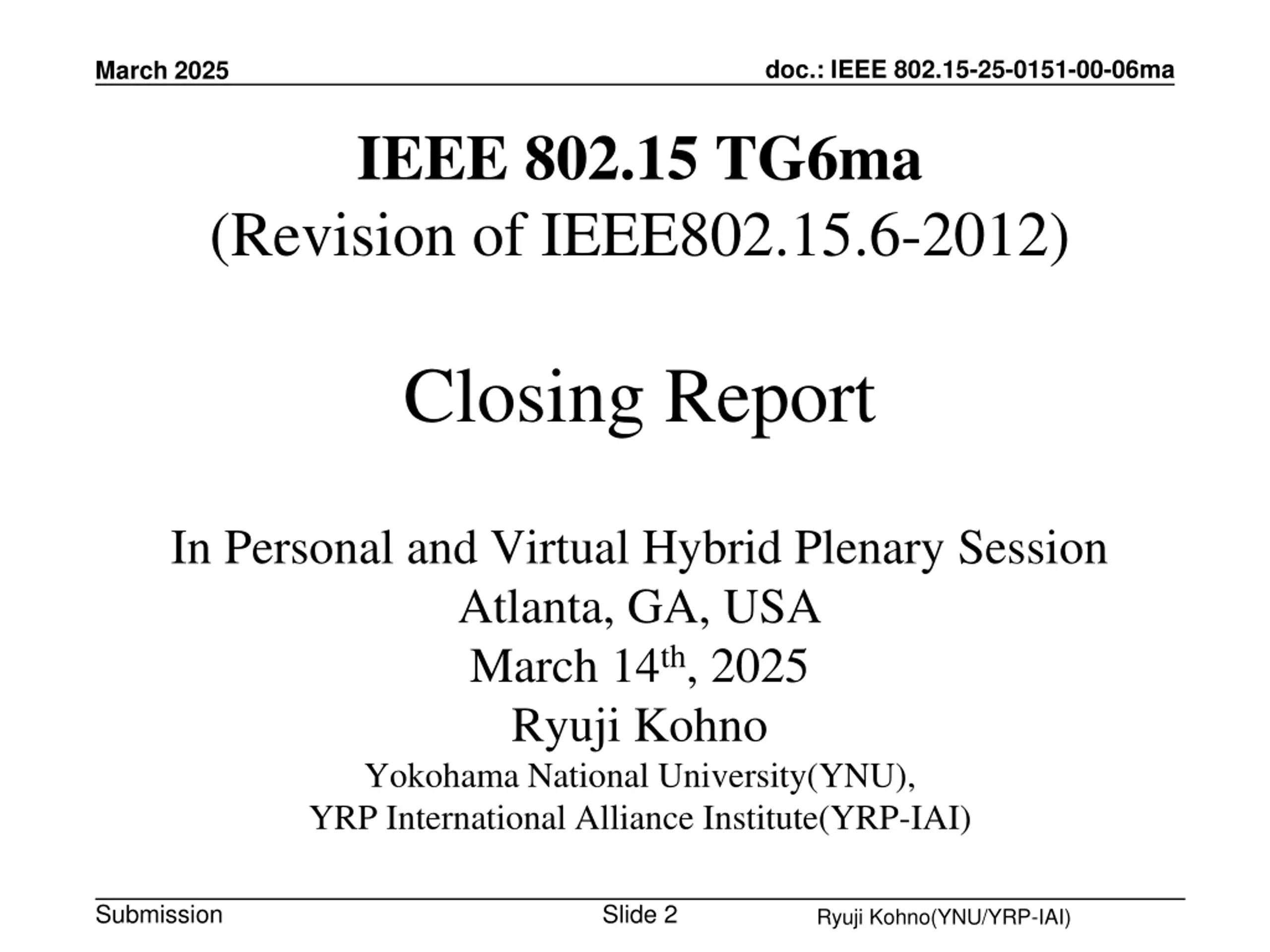 doc.: IEEE 802.15-25-0151-00-06ma March 2025 IEEE 802.15 TG6ma (Revision of IEEE802.15.6-2012) Closing Report In Personal and Virtual Hybrid Plenary Session Atlanta, GA, USA March 14th, 2025 Ryuji Kohno Yokohama National University(YNU), YRP International Alliance Institute(YRP-IAI) Submission Slide 2 Ryuji Kohno(YNU/YRP-IAI)