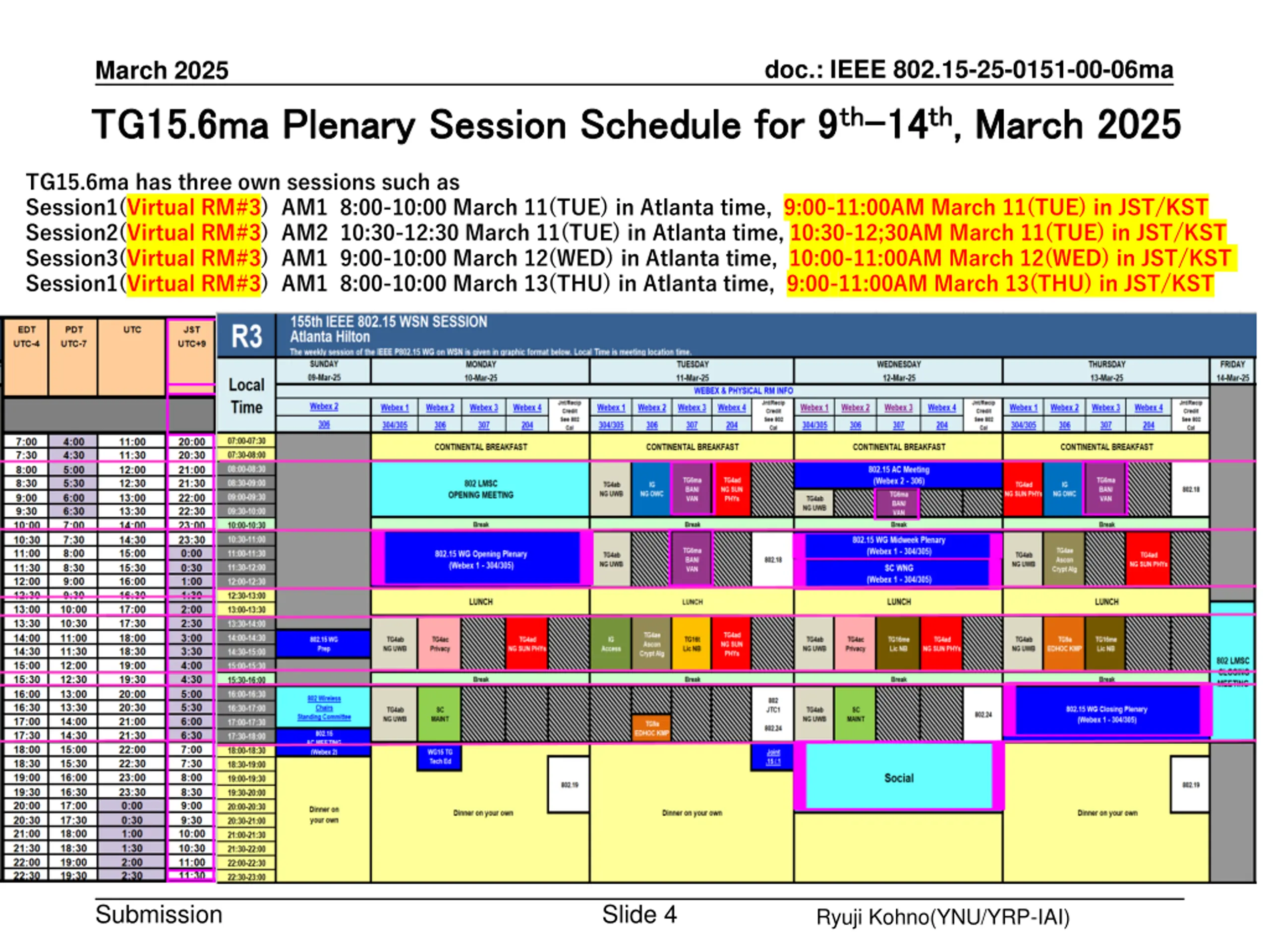 doc.: IEEE 802.15-25-0151-00-06ma 14th th, March 2025 , March 2025 March 2025 TG15.6ma Plenary Session Schedule for 9 TG15.6ma Plenary Session Schedule for 9th th- -14 TG15.6ma has three own sessions such as Session1(Virtual RM#3) AM1 8:00-10:00 March 11(TUE) in Atlanta time, 9:00-11:00AM March 11(TUE) in JST/KST Session2(Virtual RM#3) AM2 10:30-12:30 March 11(TUE) in Atlanta time, 10:30-12;30AM March 11(TUE) in JST/KST Session3(Virtual RM#3) AM1 9:00-10:00 March 12(WED) in Atlanta time, 10:00-11:00AM March 12(WED) in JST/KST Session1(Virtual RM#3) AM1 8:00-10:00 March 13(THU) in Atlanta time, 9:00-11:00AM March 13(THU) in JST/KST Submission Slide 4 Ryuji Kohno(YNU/YRP-IAI)