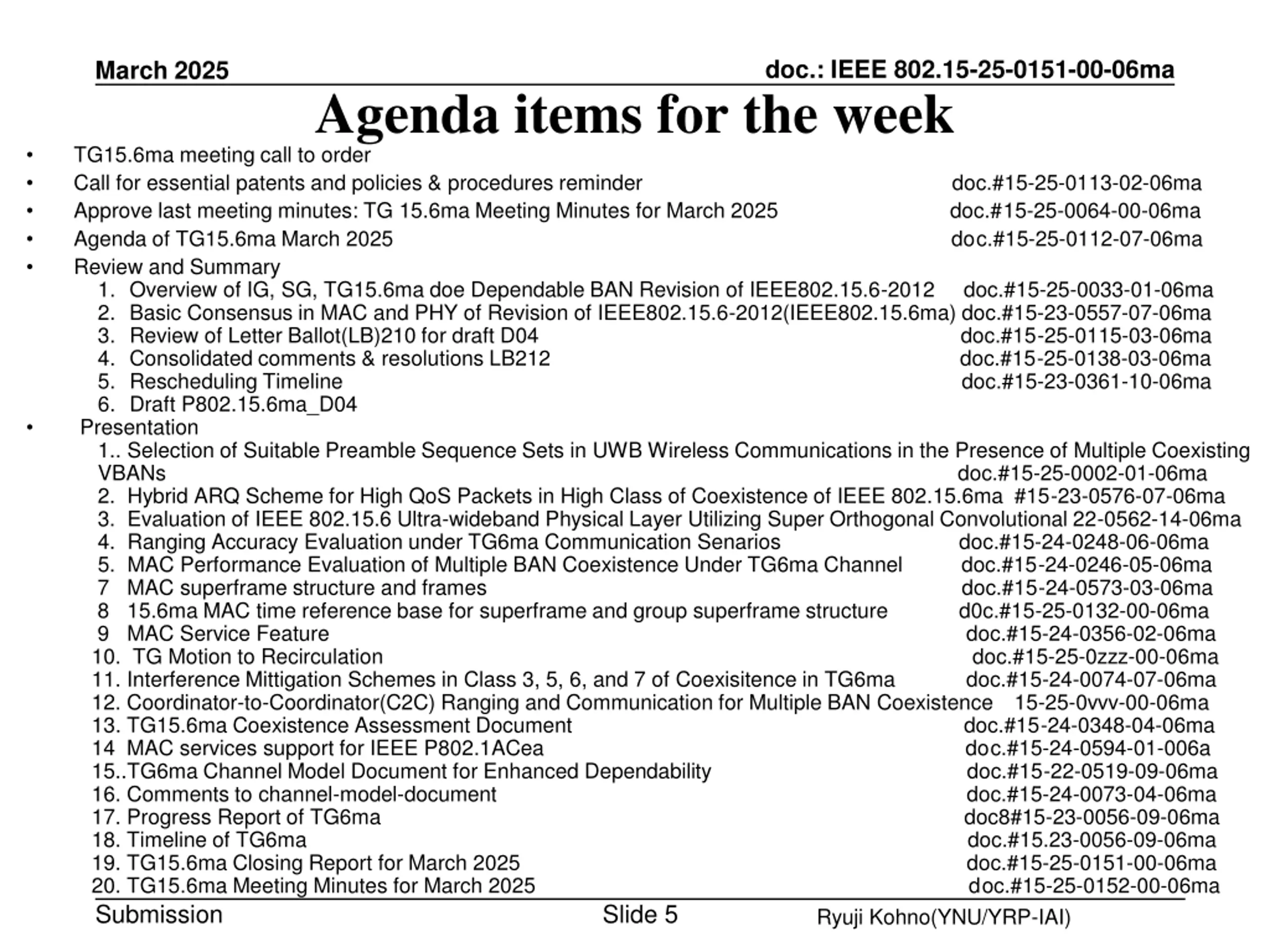 doc.: IEEE 802.15-25-0151-00-06ma March 2025 Agenda items for the week TG15.6ma meeting call to order Call for essential patents and policies & procedures reminder doc.#15-25-0113-02-06ma Approve last meeting minutes: TG 15.6ma Meeting Minutes for March 2025 doc.#15-25-0064-00-06ma Agenda of TG15.6ma March 2025 doc.#15-25-0112-07-06ma Review and Summary 1. Overview of IG, SG, TG15.6ma doe Dependable BAN Revision of IEEE802.15.6-2012 doc.#15-25-0033-01-06ma 2. Basic Consensus in MAC and PHY of Revision of IEEE802.15.6-2012(IEEE802.15.6ma) doc.#15-23-0557-07-06ma 3. Review of Letter Ballot(LB)210 for draft D04 doc.#15-25-0115-03-06ma 4. Consolidated comments & resolutions LB212 doc.#15-25-0138-03-06ma 5. Rescheduling Timeline doc.#15-23-0361-10-06ma 6. Draft P802.15.6ma_D04 Presentation 1.. Selection of Suitable Preamble Sequence Sets in UWB Wireless Communications in the Presence of Multiple Coexisting VBANs 2. Hybrid ARQ Scheme for High QoS Packets in High Class of Coexistence of IEEE 802.15.6ma #15-23-0576-07-06ma 3. Evaluation of IEEE 802.15.6 Ultra-wideband Physical Layer Utilizing Super Orthogonal Convolutional 22-0562-14-06ma 4. Ranging Accuracy Evaluation under TG6ma Communication Senarios doc.#15-24-0248-06-06ma 5. MAC Performance Evaluation of Multiple BAN Coexistence Under TG6ma Channel doc.#15-24-0246-05-06ma 7 MAC superframe structure and frames doc.#15-24-0573-03-06ma 8 15.6ma MAC time reference base for superframe and group superframe structure d0c.#15-25-0132-00-06ma 9 MAC Service Feature 10. TG Motion to Recirculation 11. Interference Mittigation Schemes in Class 3, 5, 6, and 7 of Coexisitence in TG6ma doc.#15-24-0074-07-06ma 12. Coordinator-to-Coordinator(C2C) Ranging and Communication for Multiple BAN Coexistence 13. TG15.6ma Coexistence Assessment Document doc.#15-24-0348-04-06ma 14 MAC services support for IEEE P802.1ACea doc.#15-24-0594-01-006a 15..TG6ma Channel Model Document for Enhanced Dependability doc.#15-22-0519-09-06ma 16. Comments to channel-model-document doc.#15-24-0073-04-06ma 17. Progress Report of TG6ma 18. Timeline of TG6ma 19. TG15.6ma Closing Report for March 2025 doc.#15-25-0151-00-06ma 20. TG15.6ma Meeting Minutes for March 2025 doc.#15-25-0152-00-06ma Slide 5 doc.#15-25-0002-01-06ma doc.#15-24-0356-02-06ma doc.#15-25-0zzz-00-06ma 15-25-0vvv-00-06ma doc8#15-23-0056-09-06ma doc.#15.23-0056-09-06ma Submission Ryuji Kohno(YNU/YRP-IAI)