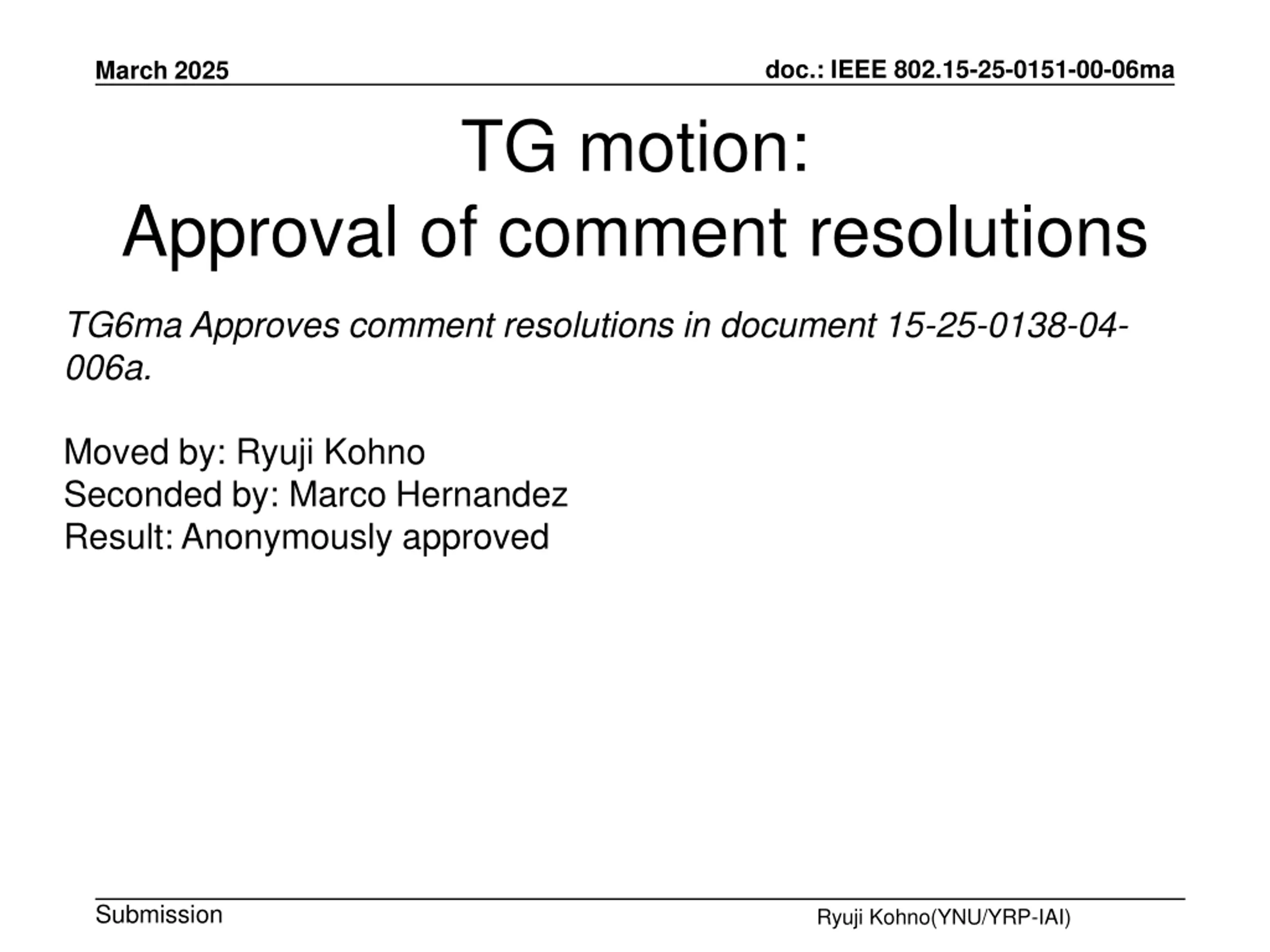 doc.: IEEE 802.15-25-0151-00-06ma March 2025 TG motion: Approval of comment resolutions TG6ma Approves comment resolutions in document 15-25-0138-04- 006a. Moved by: Ryuji Kohno Seconded by: Marco Hernandez Result: Anonymously approved Submission Ryuji Kohno(YNU/YRP-IAI)