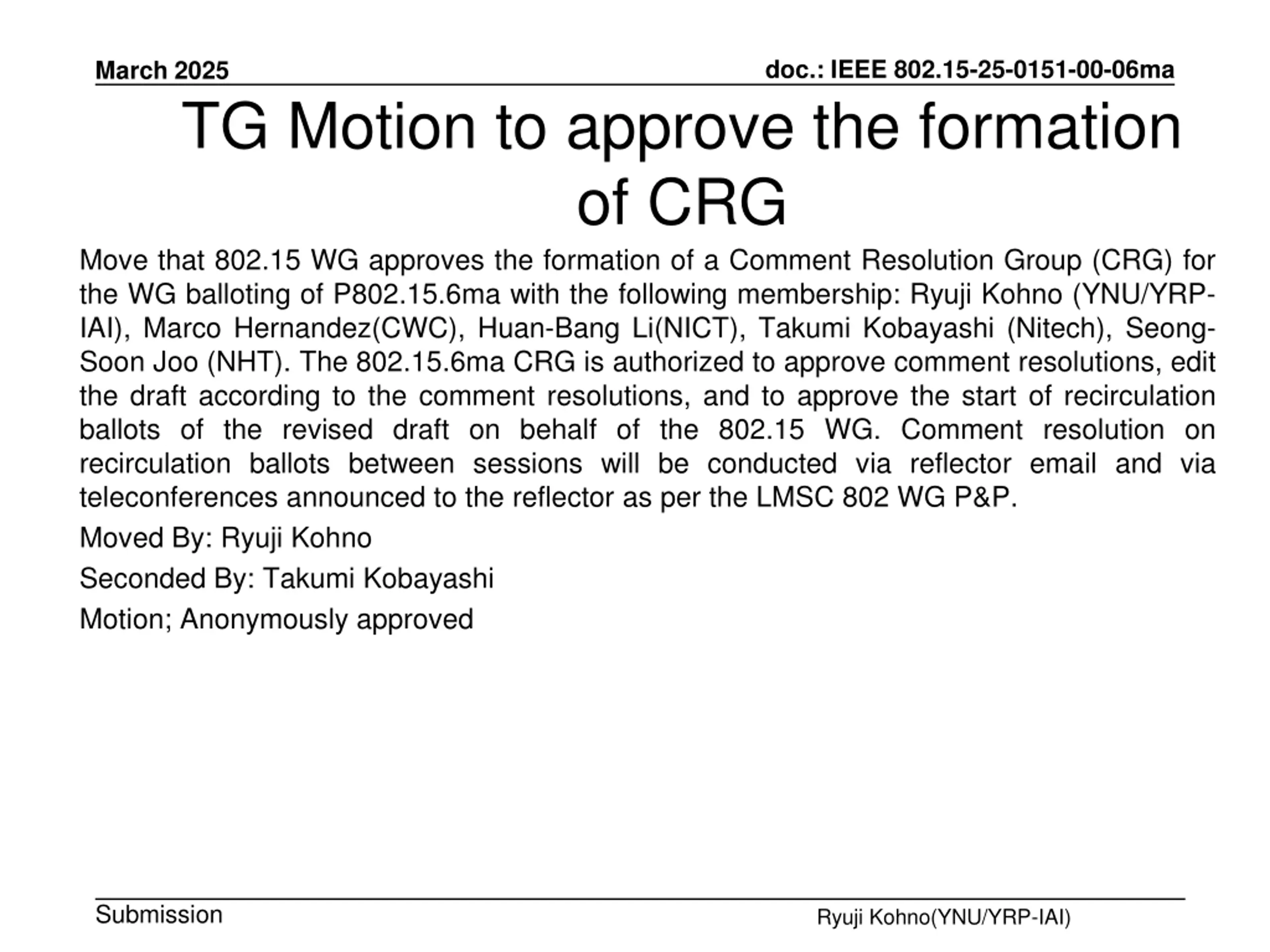 doc.: IEEE 802.15-25-0151-00-06ma March 2025 TG Motion to approve the formation of CRG Move that 802.15 WG approves the formation of a Comment Resolution Group (CRG) for the WG balloting of P802.15.6ma with the following membership: Ryuji Kohno (YNU/YRP- IAI), Marco Hernandez(CWC), Huan-Bang Li(NICT), Takumi Kobayashi (Nitech), Seong- Soon Joo (NHT). The 802.15.6ma CRG is authorized to approve comment resolutions, edit the draft according to the comment resolutions, and to approve the start of recirculation ballots of the revised draft on behalf of the 802.15 WG. Comment resolution on recirculation ballots between sessions will be conducted via reflector email and via teleconferences announced to the reflector as per the LMSC 802 WG P&P. Moved By: Ryuji Kohno Seconded By: Takumi Kobayashi Motion; Anonymously approved Submission Ryuji Kohno(YNU/YRP-IAI)