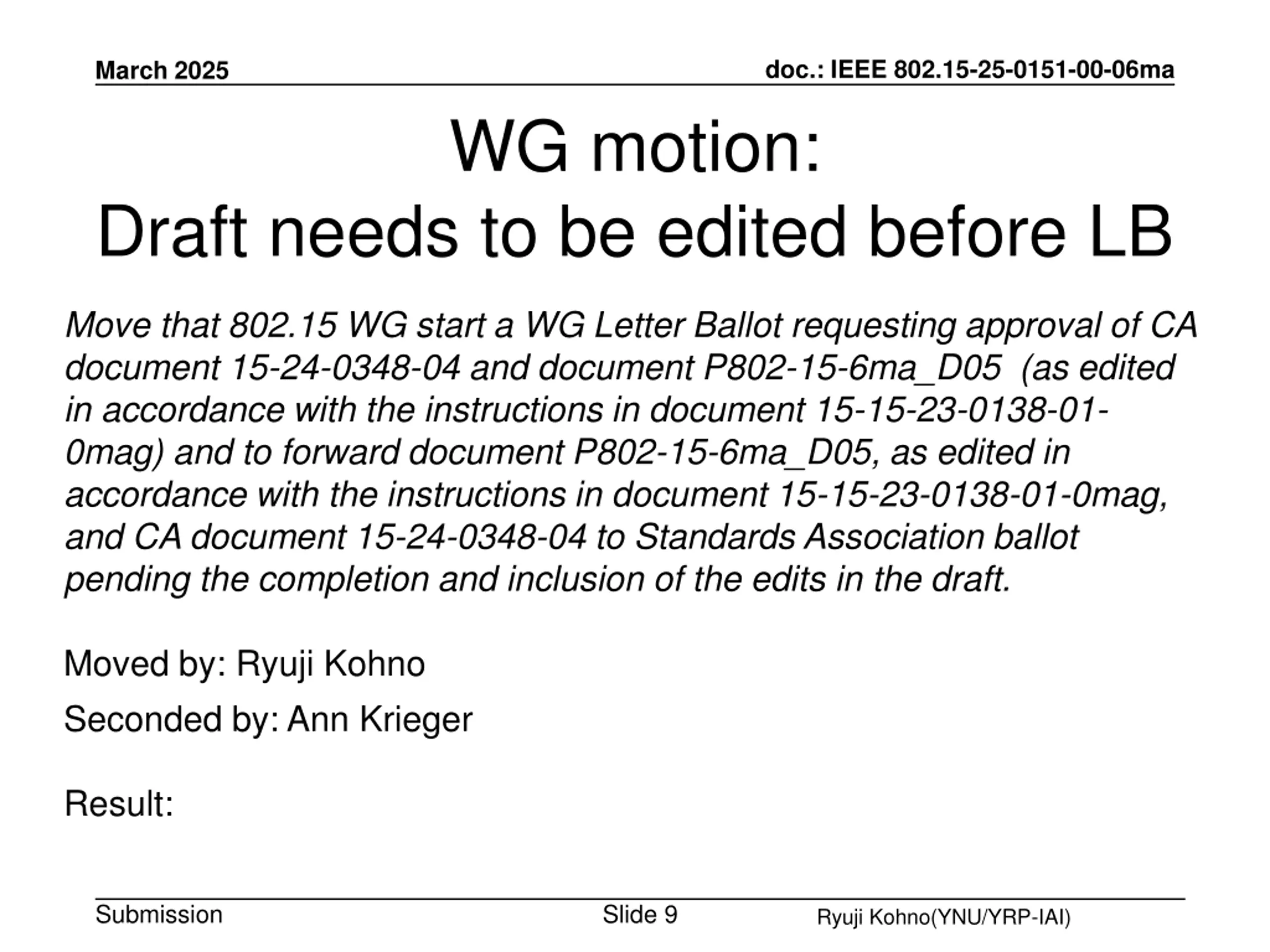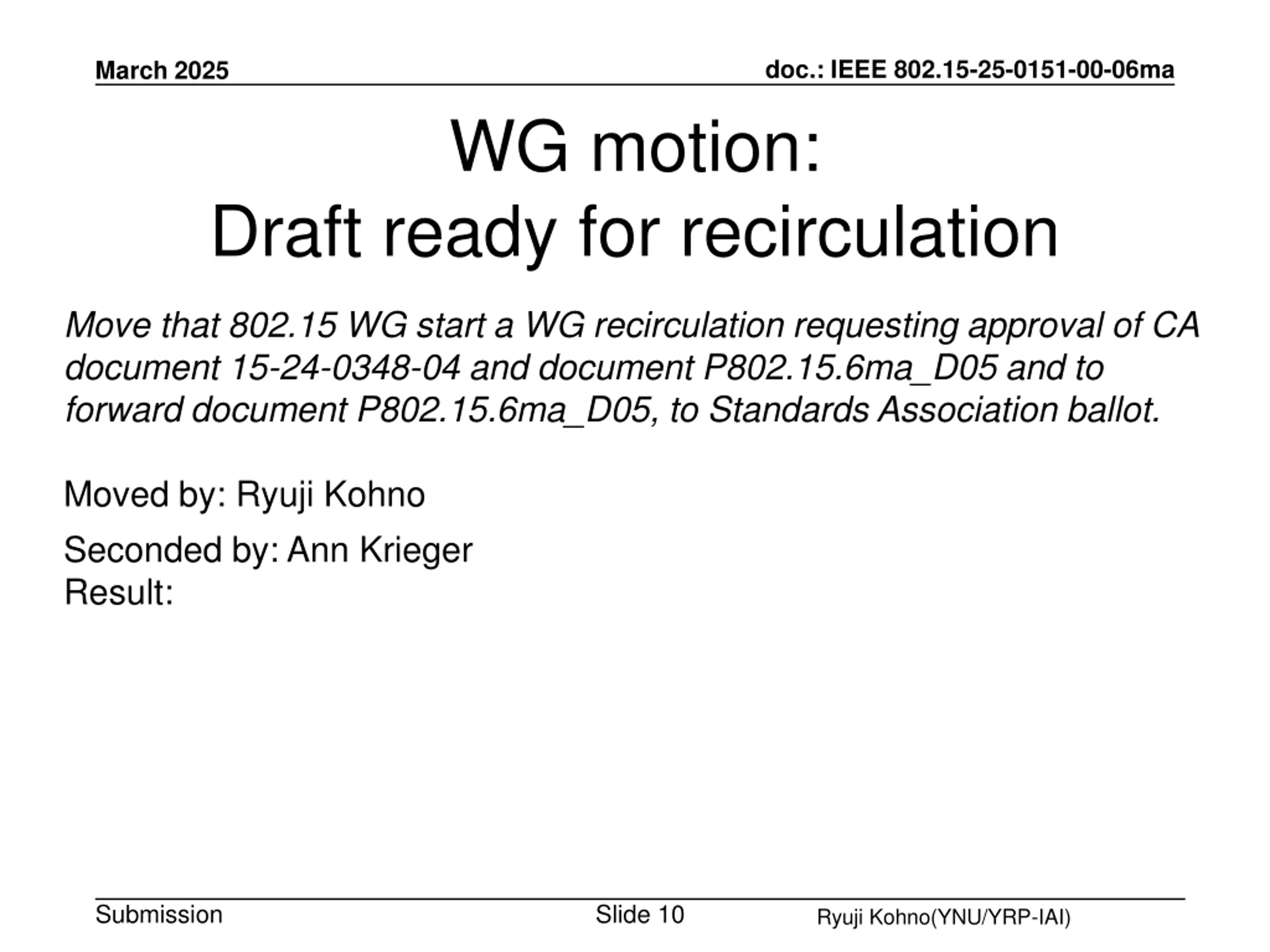 doc.: IEEE 802.15-25-0151-00-06ma March 2025 WG motion: Draft needs to be edited before LB Move that 802.15 WG start a WG Letter Ballot requesting approval of CA document 15-24-0348-04 and document P802-15-6ma_D05 (as edited in accordance with the instructions in document 15-15-23-0138-01- 0mag) and to forward document P802-15-6ma_D05, as edited in accordance with the instructions in document 15-15-23-0138-01-0mag, and CA document 15-24-0348-04 to Standards Association ballot pending the completion and inclusion of the edits in the draft. Moved by: Ryuji Kohno Seconded by: Ann Krieger Result: Submission Slide 9 Ryuji Kohno(YNU/YRP-IAI)