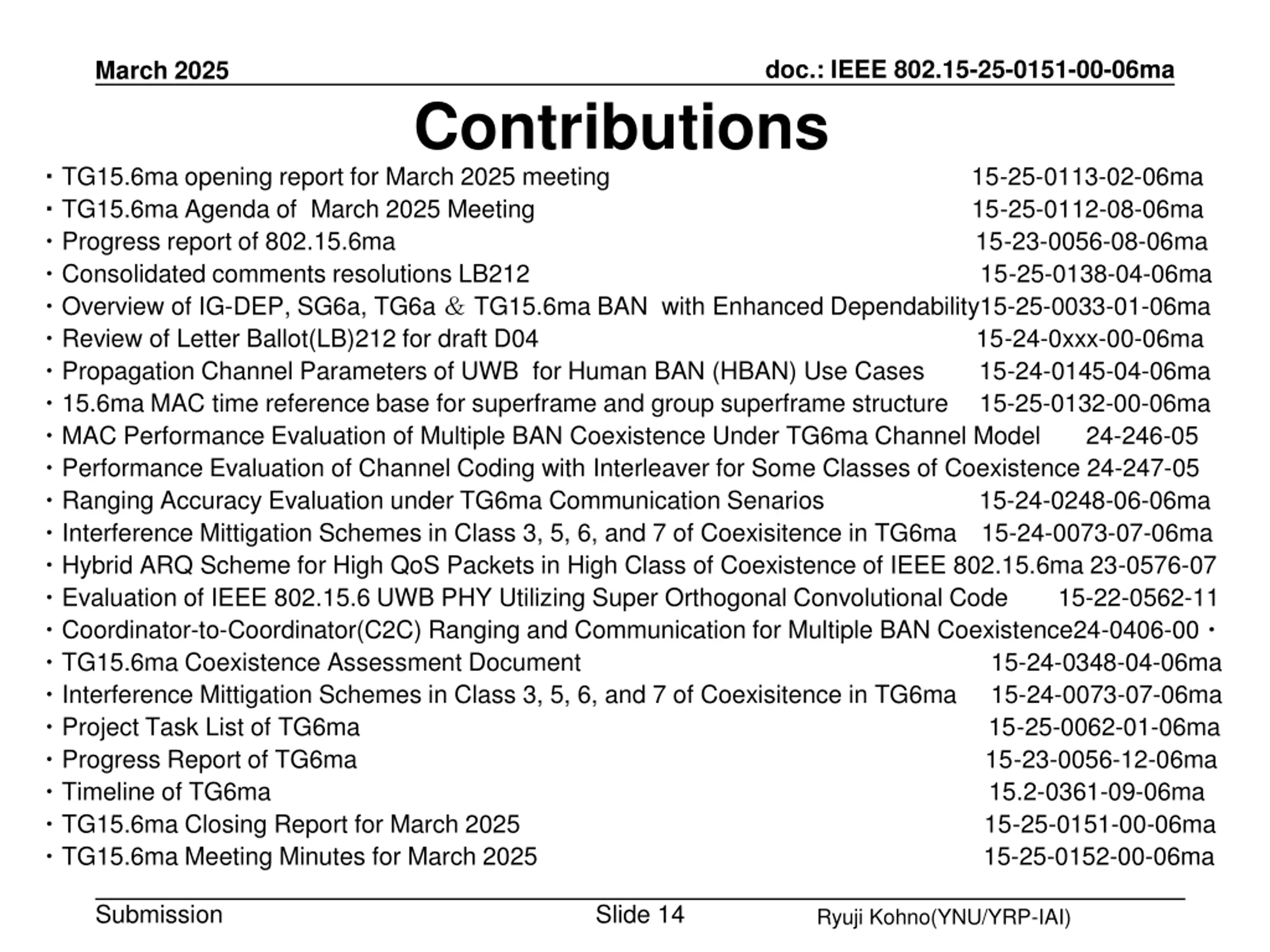 doc.: IEEE 802.15-25-0151-00-06ma March 2025 Contributions TG15.6ma opening report for March 2025 meeting 15-25-0113-02-06ma TG15.6ma Agenda of March 2025 Meeting 15-25-0112-08-06ma Progress report of 802.15.6ma 15-23-0056-08-06ma Consolidated comments resolutions LB212 15-25-0138-04-06ma Overview of IG-DEP, SG6a, TG6a TG15.6ma BAN with Enhanced Dependability15-25-0033-01-06ma Review of Letter Ballot(LB)212 for draft D04 15-24-0xxx-00-06ma Propagation Channel Parameters of UWB for Human BAN (HBAN) Use Cases 15-24-0145-04-06ma 15.6ma MAC time reference base for superframe and group superframe structure MAC Performance Evaluation of Multiple BAN Coexistence Under TG6ma Channel Model Performance Evaluation of Channel Coding with Interleaver for Some Classes of Coexistence 24-247-05 Ranging Accuracy Evaluation under TG6ma Communication Senarios Interference Mittigation Schemes in Class 3, 5, 6, and 7 of Coexisitence in TG6ma Hybrid ARQ Scheme for High QoS Packets in High Class of Coexistence of IEEE 802.15.6ma 23-0576-07 Evaluation of IEEE 802.15.6 UWB PHY Utilizing Super Orthogonal Convolutional Code Coordinator-to-Coordinator(C2C) Ranging and Communication for Multiple BAN Coexistence24-0406-00 TG15.6ma Coexistence Assessment Document Interference Mittigation Schemes in Class 3, 5, 6, and 7 of Coexisitence in TG6ma Project Task List of TG6ma 15-25-0062-01-06ma Progress Report of TG6ma 15-23-0056-12-06ma Timeline of TG6ma 15.2-0361-09-06ma TG15.6ma Closing Report for March 2025 15-25-0151-00-06ma TG15.6ma Meeting Minutes for March 2025 15-25-0132-00-06ma 24-246-05 15-24-0248-06-06ma 15-24-0073-07-06ma 15-22-0562-11 15-24-0348-04-06ma 15-24-0073-07-06ma 15-25-0152-00-06ma Submission Slide 14 Ryuji Kohno(YNU/YRP-IAI)