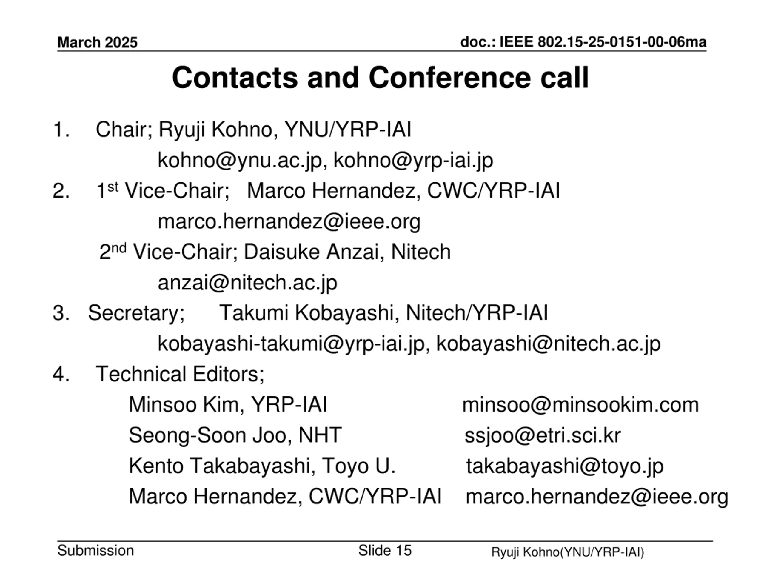 doc.: IEEE 802.15-25-0151-00-06ma March 2025 Contacts and Conference call 1. kohno@ynu.ac.jp, kohno@yrp-iai.jp 2. 1st Vice-Chair; Marco Hernandez, CWC/YRP-IAI marco.hernandez@ieee.org 2nd Vice-Chair; Daisuke Anzai, Nitech anzai@nitech.ac.jp 3. Secretary; Takumi Kobayashi, Nitech/YRP-IAI kobayashi-takumi@yrp-iai.jp, kobayashi@nitech.ac.jp 4. Technical Editors; Minsoo Kim, YRP-IAI minsoo@minsookim.com Seong-Soon Joo, NHT ssjoo@etri.sci.kr Kento Takabayashi, Toyo U. takabayashi@toyo.jp Marco Hernandez, CWC/YRP-IAI marco.hernandez@ieee.org Chair; Ryuji Kohno, YNU/YRP-IAI Submission Slide 15 Ryuji Kohno(YNU/YRP-IAI)