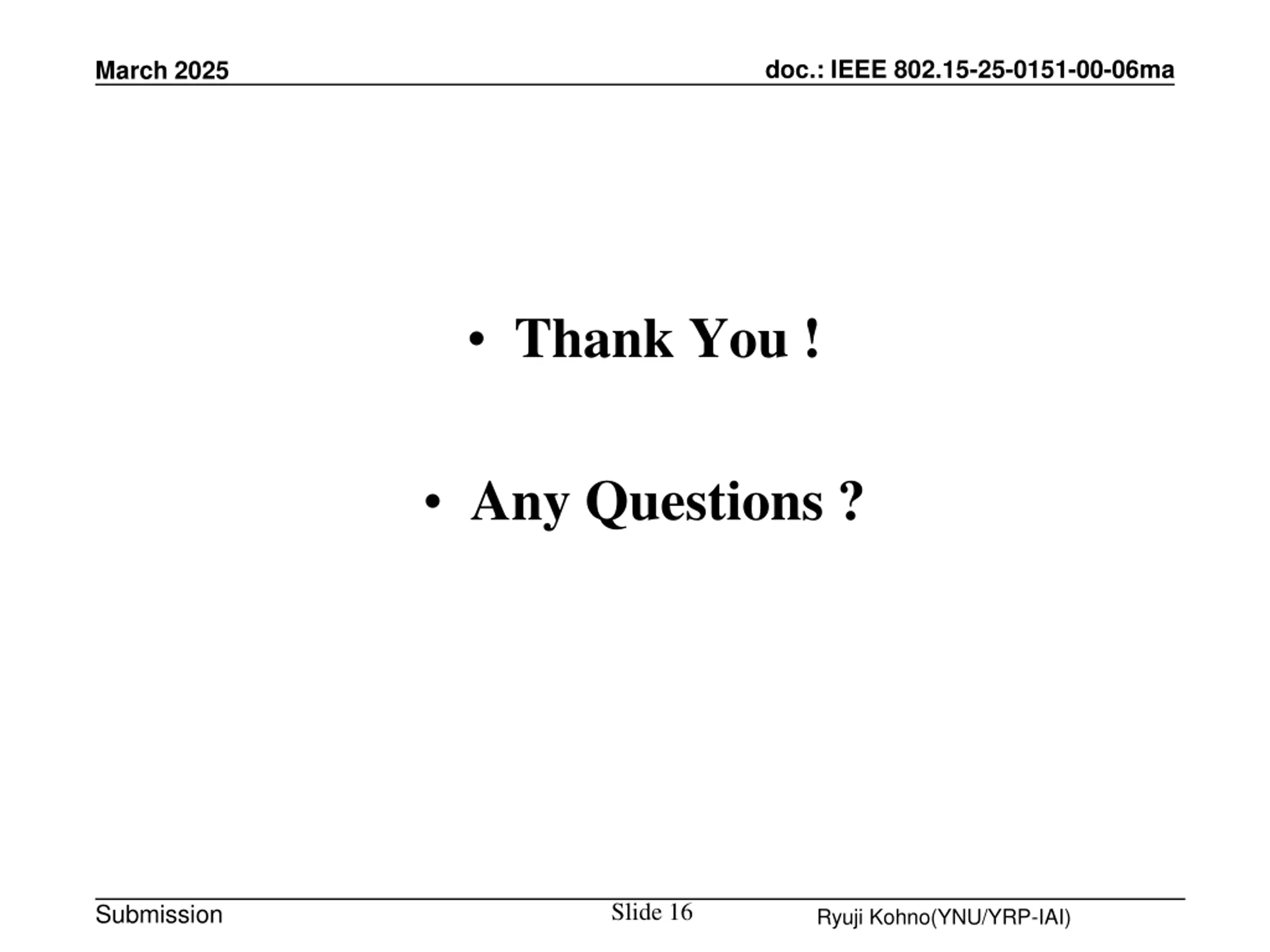 doc.: IEEE 802.15-25-0151-00-06ma March 2025 Thank You ! Any Questions ? Slide 16 Submission Ryuji Kohno(YNU/YRP-IAI)