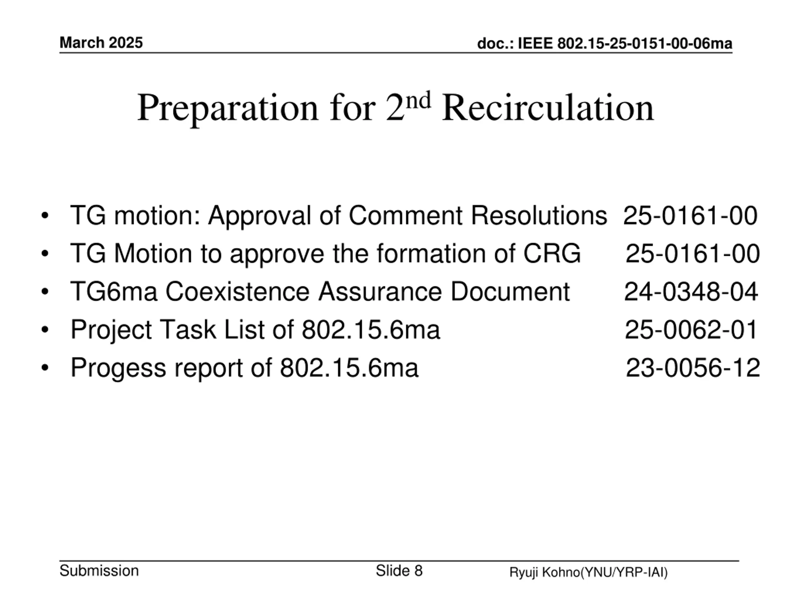March 2025 doc.: IEEE 802.15-25-0151-00-06ma Preparation for 2nd Recirculation TG motion: Approval of Comment Resolutions 25-0161-00 TG Motion to approve the formation of CRG 25-0161-00 TG6ma Coexistence Assurance Document 24-0348-04 Project Task List of 802.15.6ma Progess report of 802.15.6ma 23-0056-12 25-0062-01 Submission Slide 8 Ryuji Kohno(YNU/YRP-IAI)