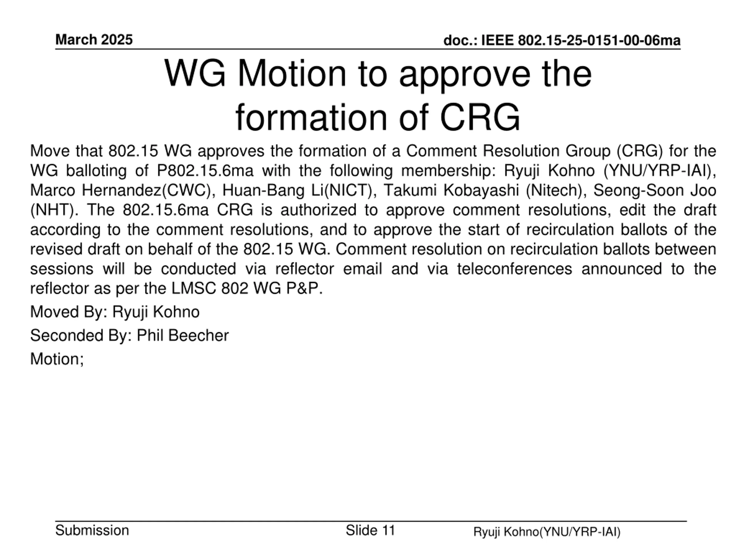 March 2025 doc.: IEEE 802.15-25-0151-00-06ma WG Motion to approve the formation of CRG Move that 802.15 WG approves the formation of a Comment Resolution Group (CRG) for the WG balloting of P802.15.6ma with the following membership: Ryuji Kohno (YNU/YRP-IAI), Marco Hernandez(CWC), Huan-Bang Li(NICT), Takumi Kobayashi (Nitech), Seong-Soon Joo (NHT). The 802.15.6ma CRG is authorized to approve comment resolutions, edit the draft according to the comment resolutions, and to approve the start of recirculation ballots of the revised draft on behalf of the 802.15 WG. Comment resolution on recirculation ballots between sessions will be conducted via reflector email and via teleconferences announced to the reflector as per the LMSC 802 WG P&P. Moved By: Ryuji Kohno Seconded By: Phil Beecher Motion; Submission Slide 11 Ryuji Kohno(YNU/YRP-IAI)