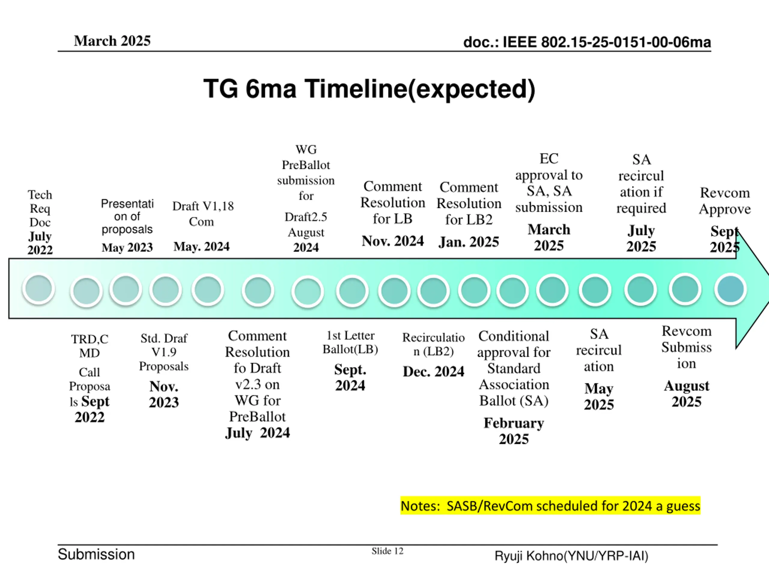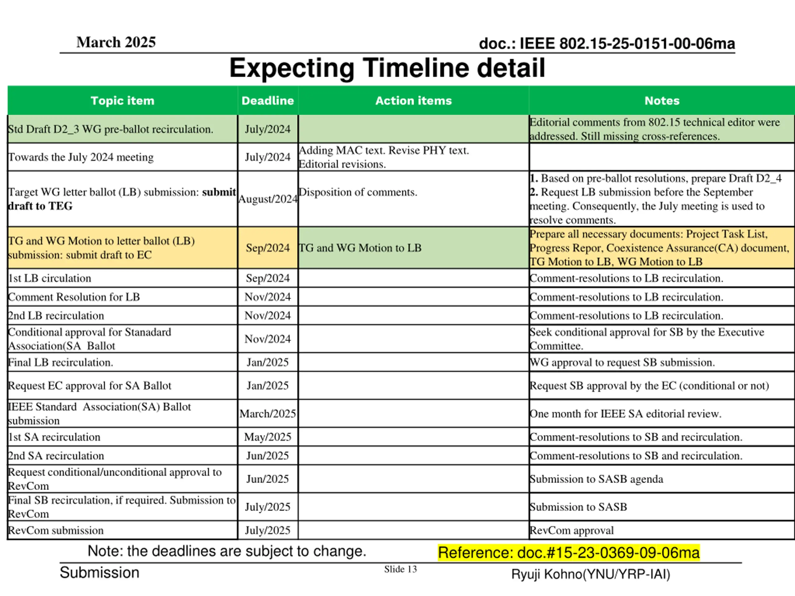 March 2025 doc.: IEEE 802.15-25-0151-00-06ma TG 6ma Timeline(expected) WG PreBallot submission for EC SA approval to SA, SA submission March 2025 recircul ation if required July 2025 Comment Resolution for LB Nov. 2024 Comment Resolution for LB2 Jan. 2025 Revcom Approve Sept 2025 Tech Req Doc July 2022 Presentati on of proposals May 2023 Draft V1,18 Com Draft2.5 August 2024 May. 2024 Revcom Submiss ion August 2025 SA Comment Resolution fo Draft v2.3 on WG for PreBallot July 2024 Conditional approval for Standard Association Ballot (SA) February 2025 1st Letter Ballot(LB) Sept. 2024 Recirculatio n (LB2) Dec. 2024 Std. Draf V1.9 Proposals Nov. 2023 TRD,C MD Call Proposa ls Sept 2022 recircul ation May 2025 Notes: SASB/RevCom scheduled for 2024 a guess Submission Slide 12 Ryuji Kohno(YNU/YRP-IAI)