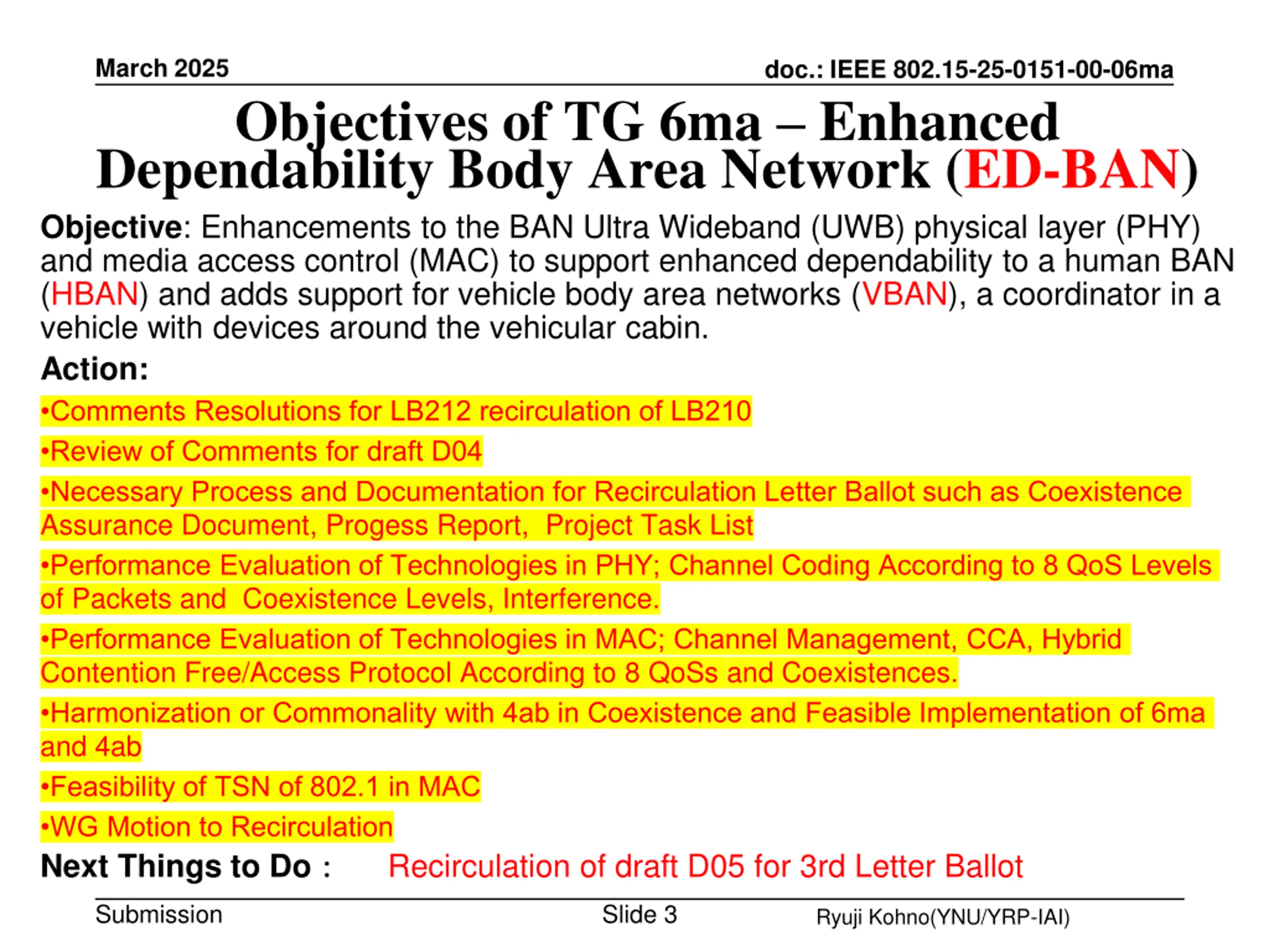 March 2025 doc.: IEEE 802.15-25-0151-00-06ma Objectives of TG 6ma Enhanced Dependability Body Area Network (ED-BAN) Objective: Enhancements to the BAN Ultra Wideband (UWB) physical layer (PHY) and media access control (MAC) to support enhanced dependability to a human BAN (HBAN) and adds support for vehicle body area networks (VBAN), a coordinator in a vehicle with devices around the vehicular cabin. Action: Comments Resolutions for LB212 recirculation of LB210 Review of Comments for draft D04 Necessary Process and Documentation for Recirculation Letter Ballot such as Coexistence Assurance Document, Progess Report, Project Task List Performance Evaluation of Technologies in PHY; Channel Coding According to 8 QoS Levels of Packets and Coexistence Levels, Interference. Performance Evaluation of Technologies in MAC; Channel Management, CCA, Hybrid Contention Free/Access Protocol According to 8 QoSs and Coexistences. Harmonization or Commonality with 4ab in Coexistence and Feasible Implementation of 6ma and 4ab Feasibility of TSN of 802.1 in MAC WG Motion to Recirculation Next Things to Do Recirculation of draft D05 for 3rd Letter Ballot Submission Slide 3 Ryuji Kohno(YNU/YRP-IAI)