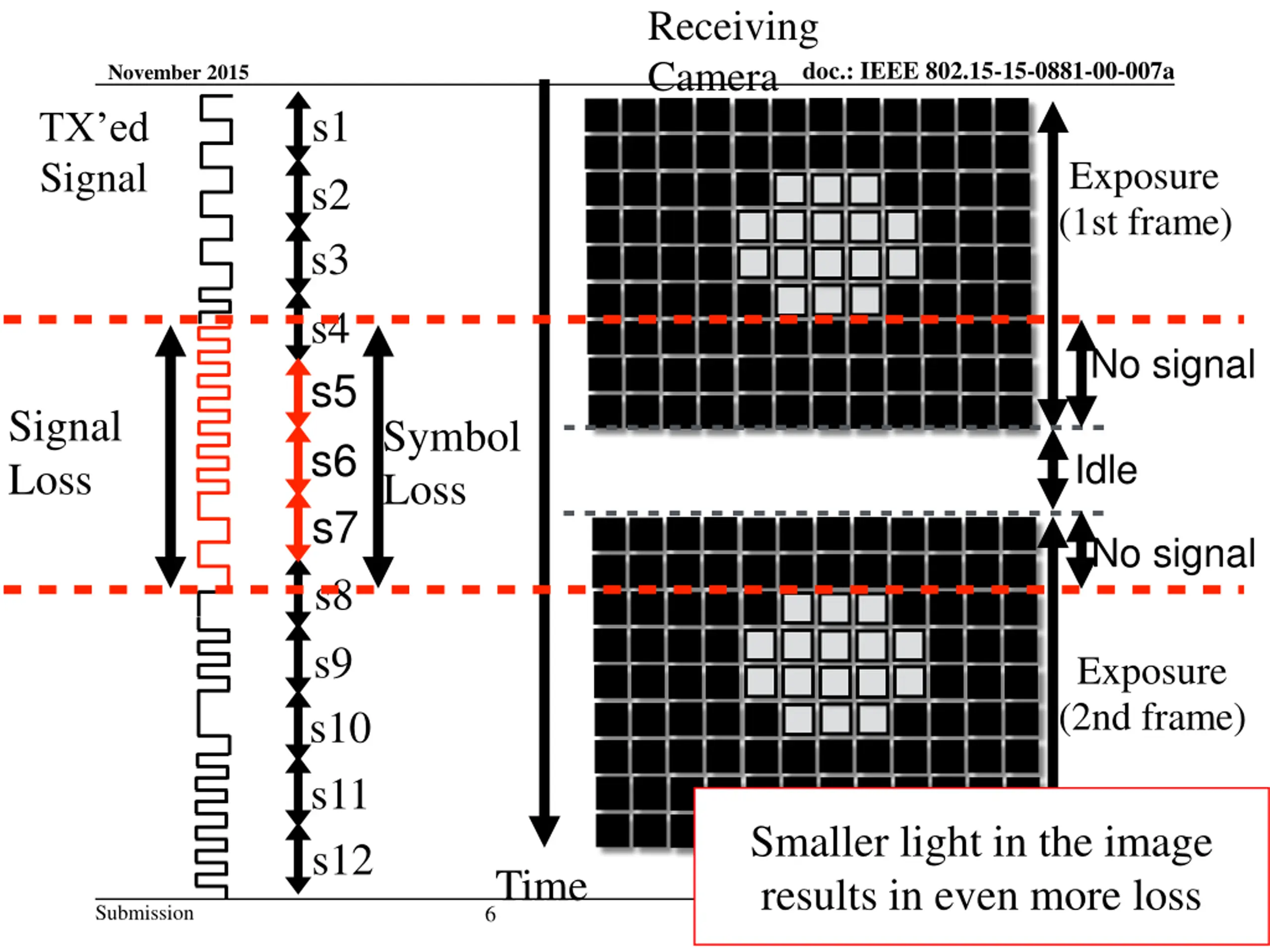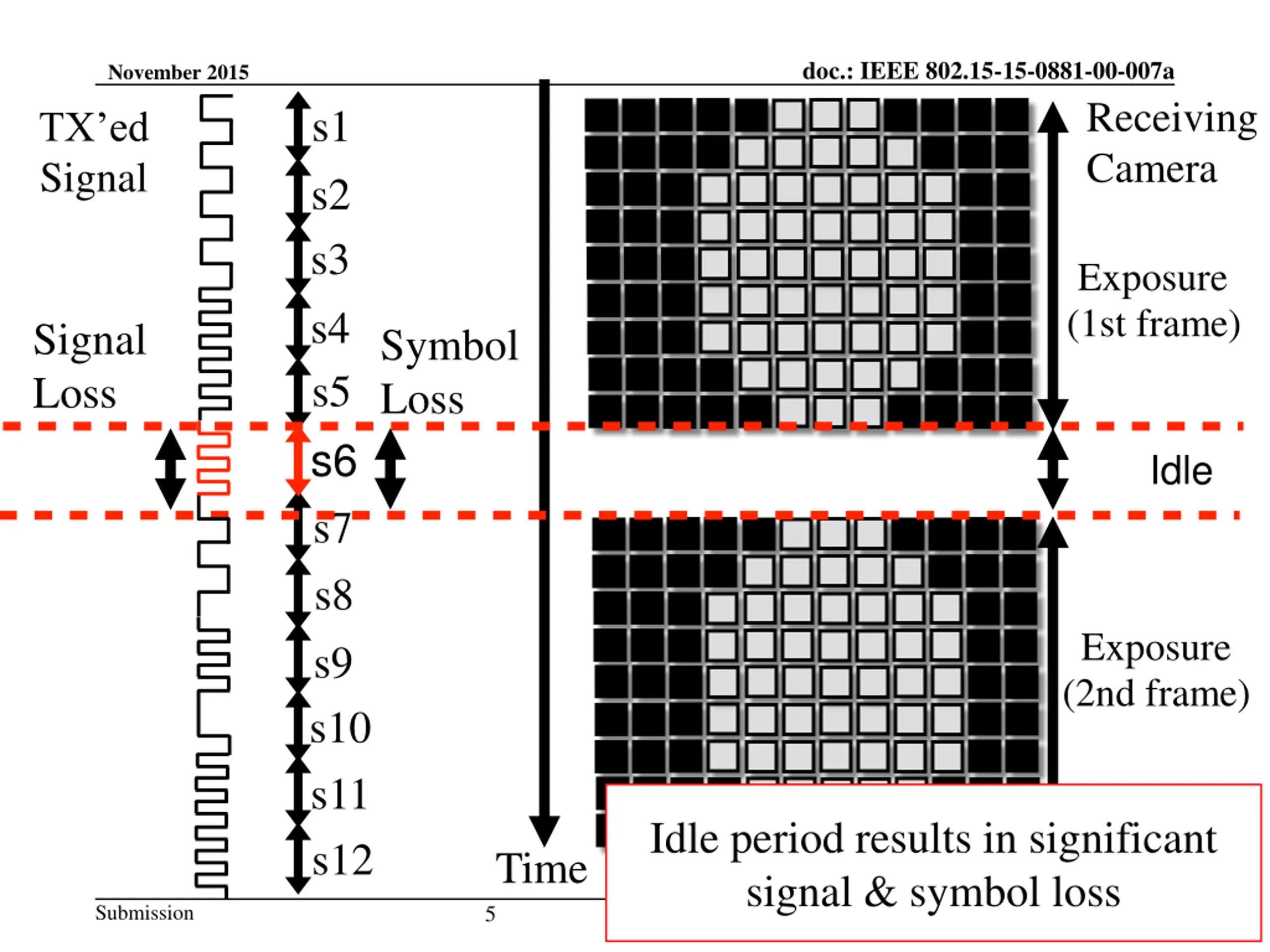 doc.: IEEE 802.15-15-0881-00-007a November 2015 Receiving Camera s1 s2 s3 s4 s5 s6 s7 s8 s9 s10 s11 s12 TX ed Signal Exposure (1st frame) Signal Loss Symbol Loss Idle Exposure (2nd frame) Idle period results in significant signal & symbol loss Time 5 Submission